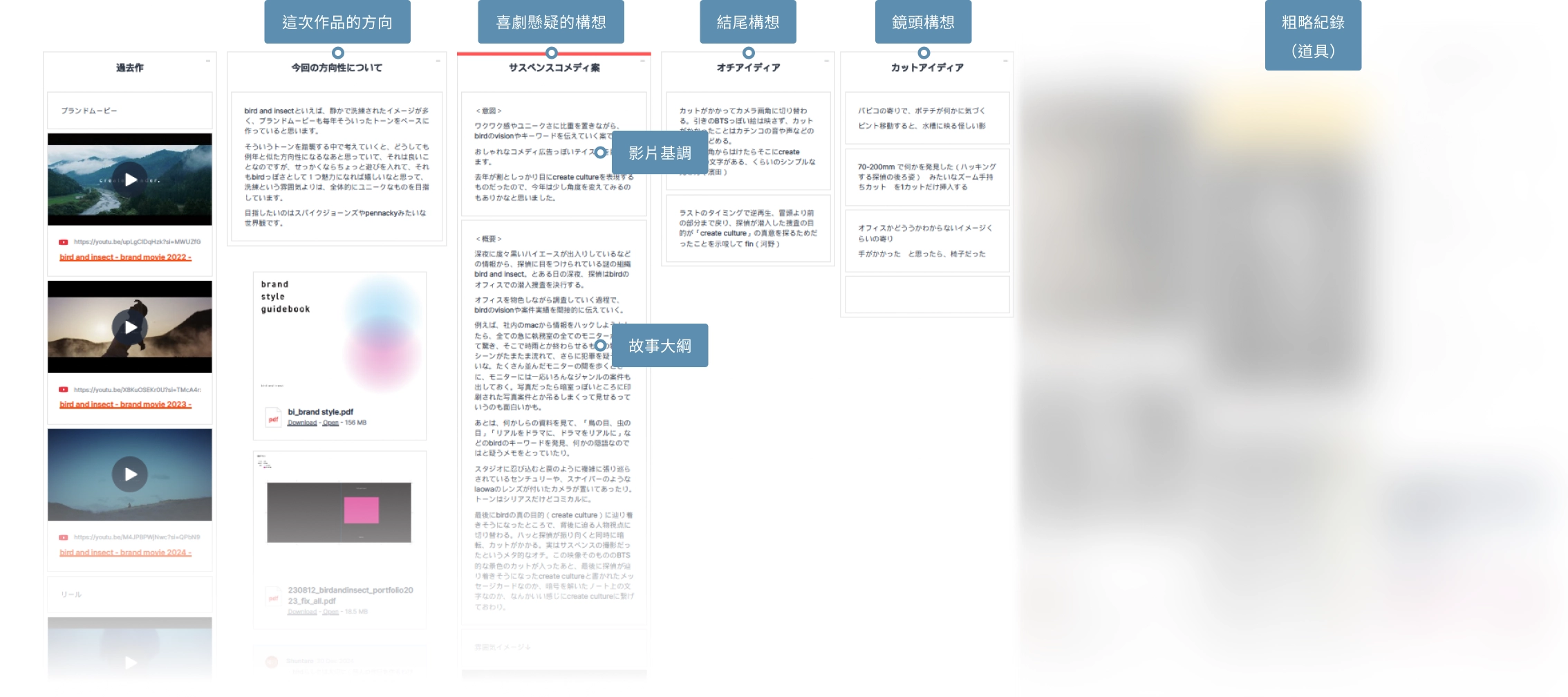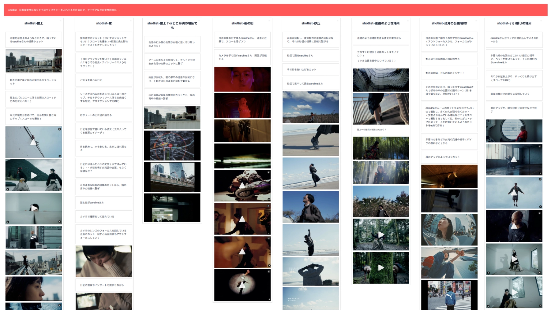 「基調(トンマナ)」是 tone & manner 的縮寫,指廣告或影片中在色彩、樣式、音樂等元素上的一致規則,用來營造統一的世界觀。這是白映多元來台拍攝課程案例時,利用多種參考資料來抓出影像基調的範例。