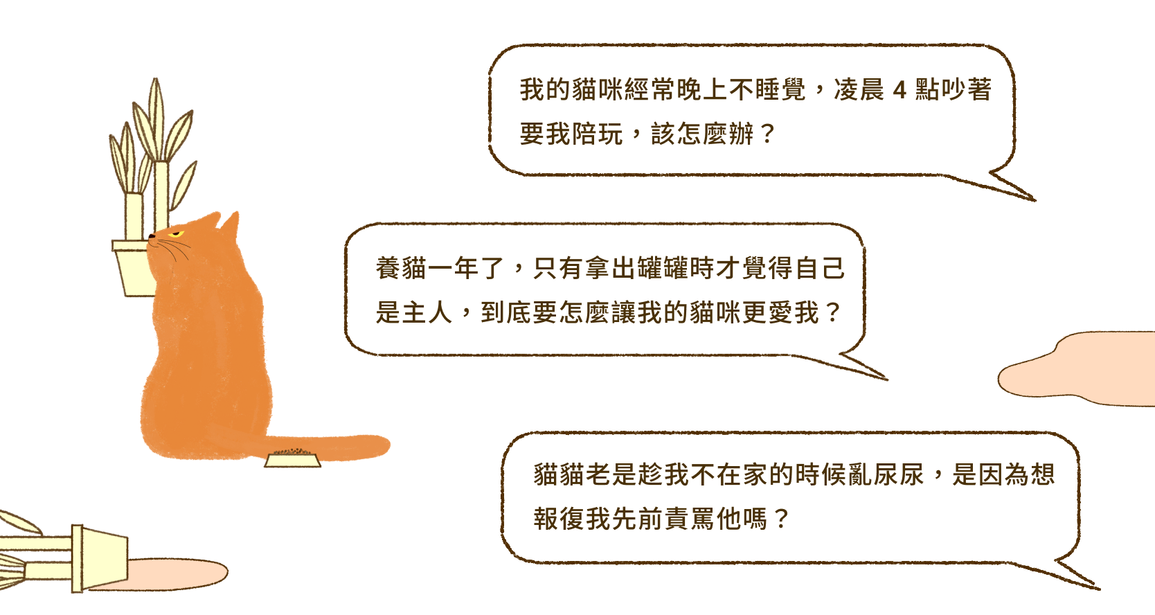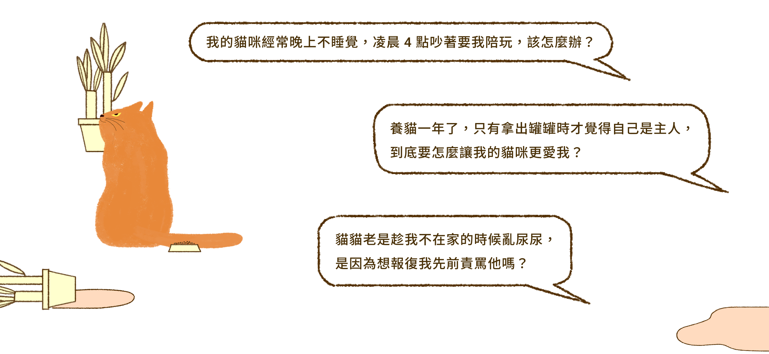 回家沒幾天,橘小橘開始出現各種異常的行為問題,亂撒尿是小事,每天半夜不停哭嚎,創造都市叢林的環繞音效,才讓我既頭痛又心疼。為了安撫他的情緒,我得夜夜抱著顫抖的小橘,直到凌晨重播的八點檔終於演完,才能勉強闔上眼(我因此能倒背如流所有狗血劇情...)。我窮盡各種門路,卻一次次被這隻聰明的貓男孩擊敗,於是轉往國外尋求資源,希望獲得與各國專業動物行為諮詢師交流的機會。