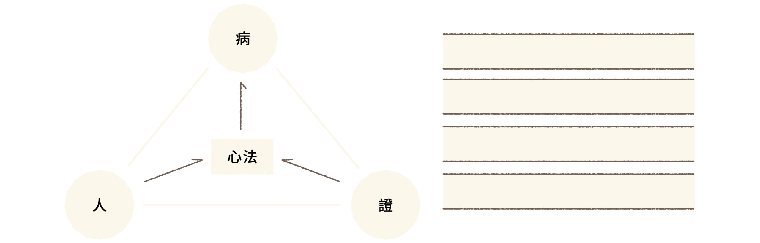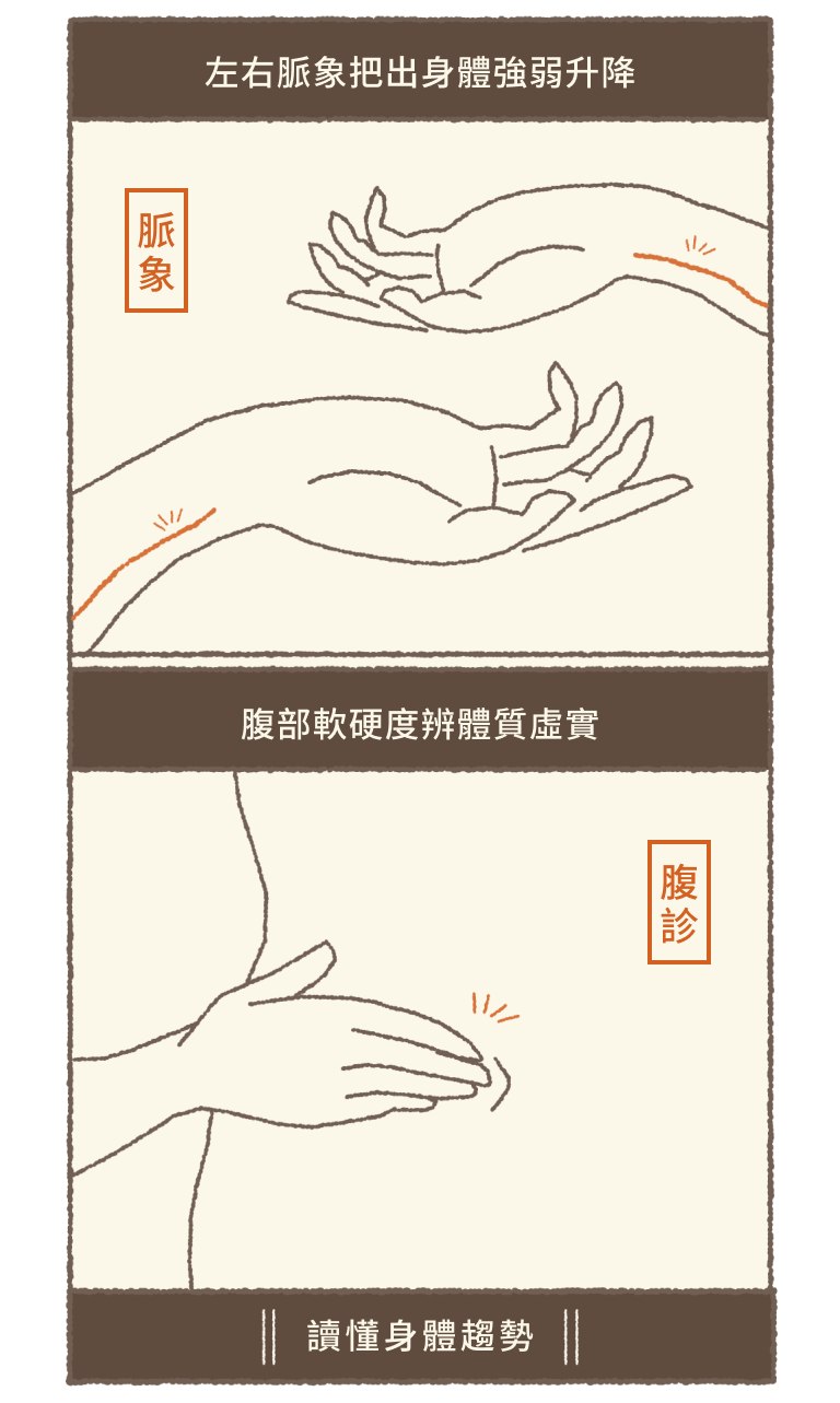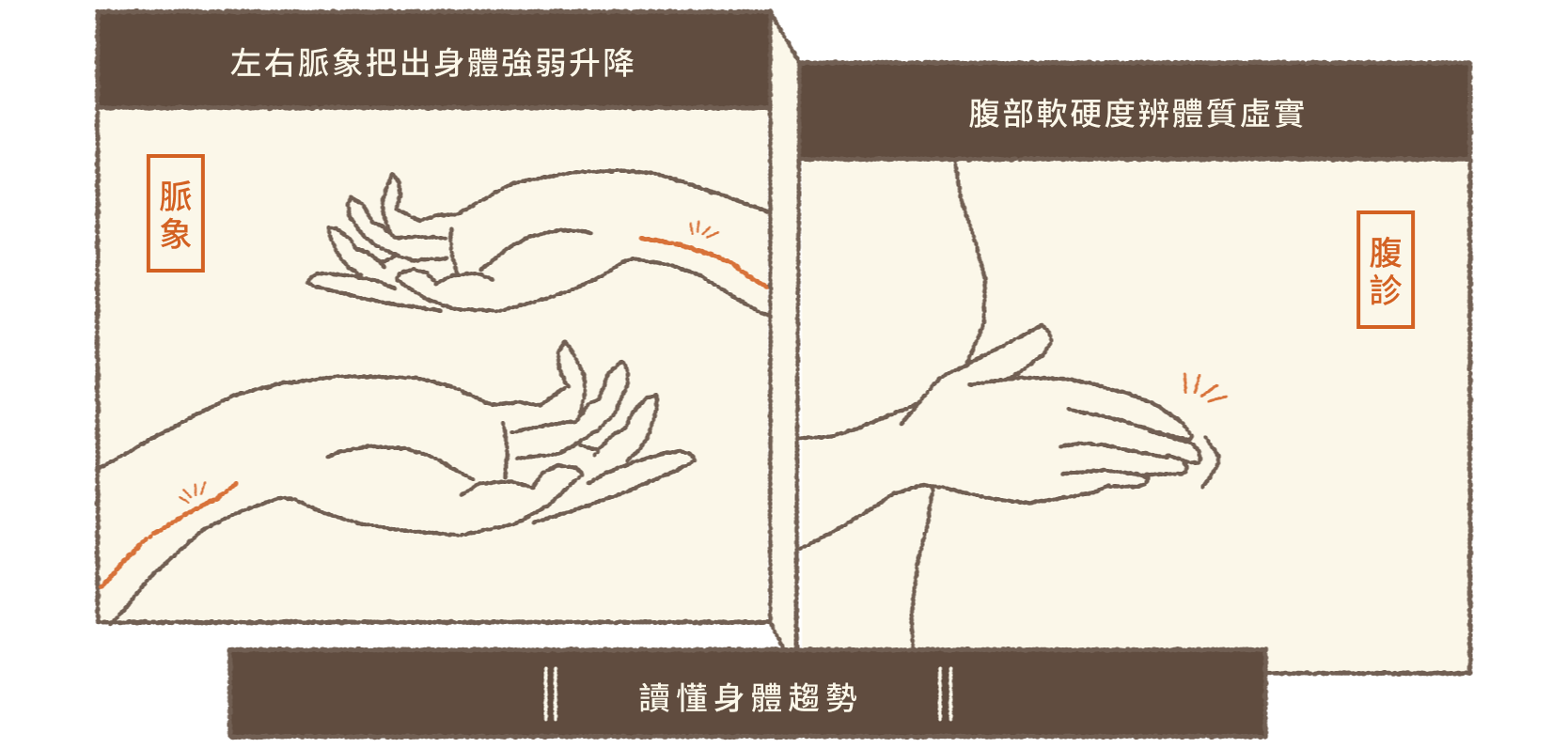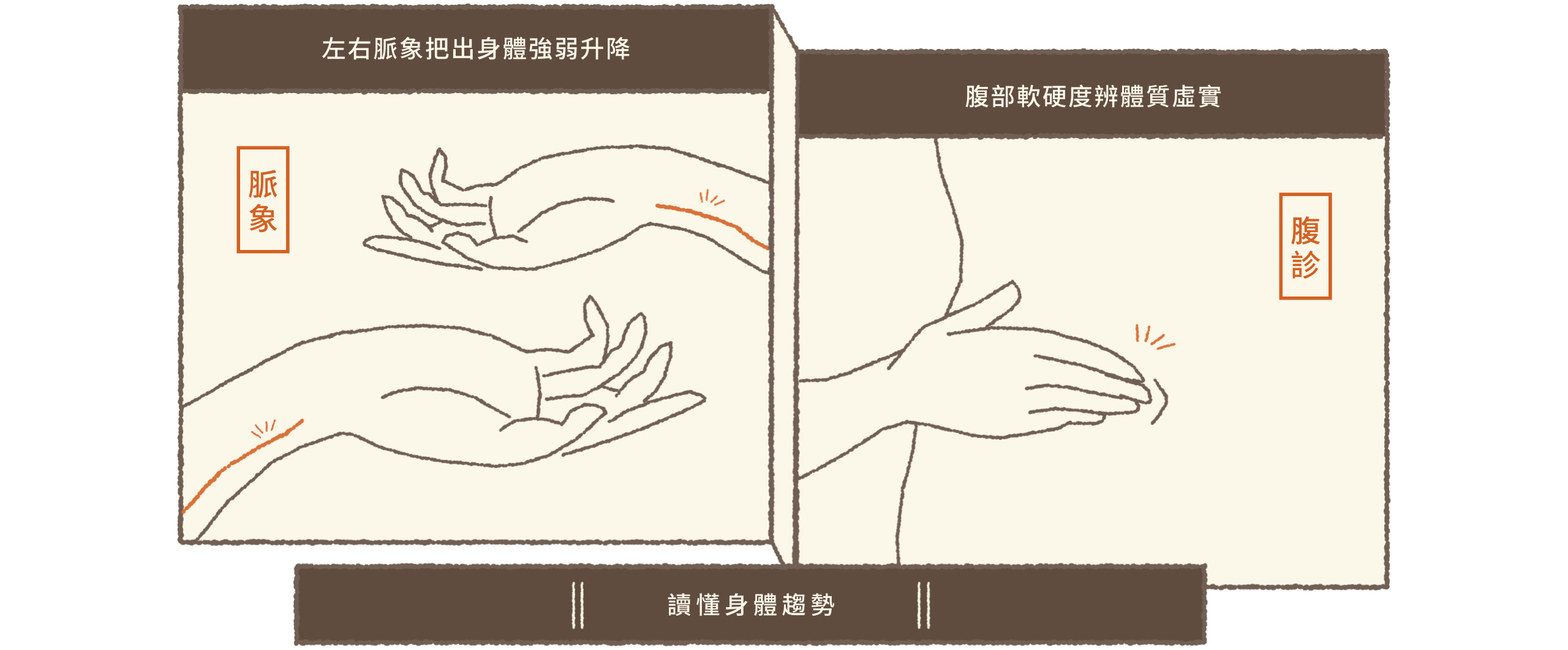 觀察並彙整身體的訊息與徵兆,並以腹診與脈象解讀身體的虛實與趨勢