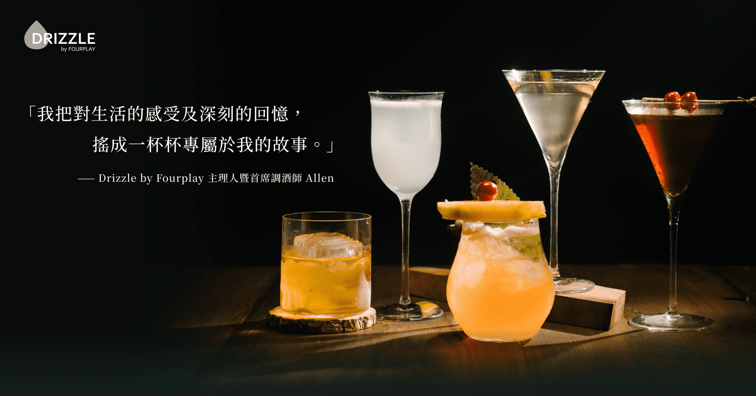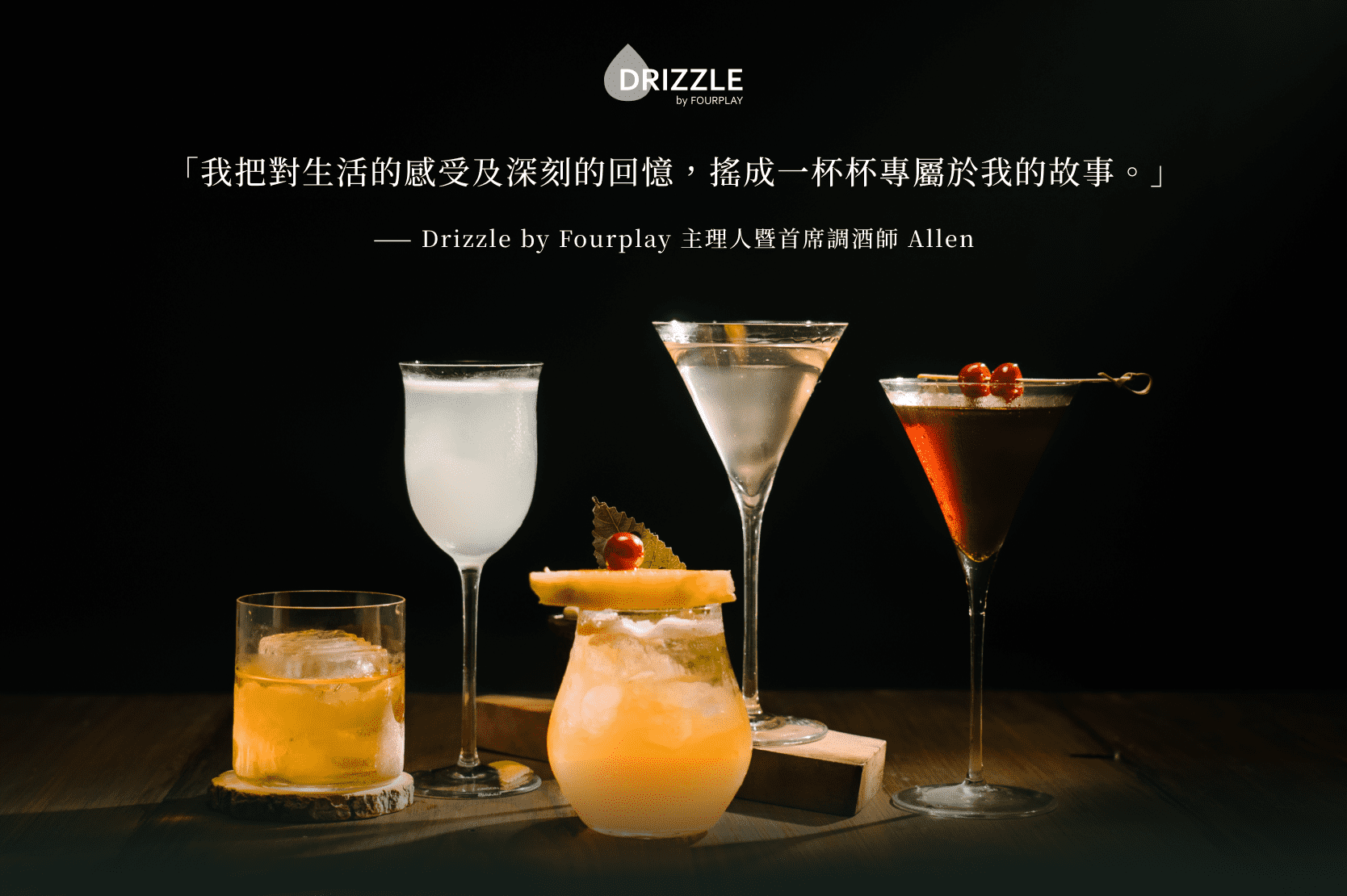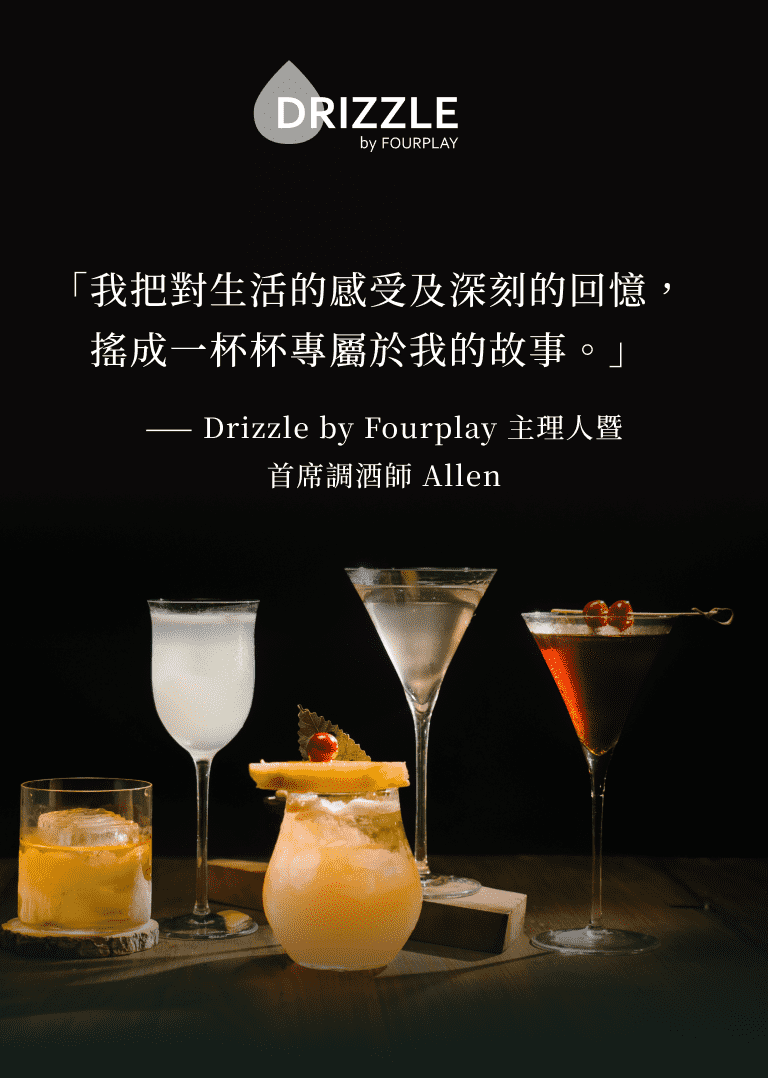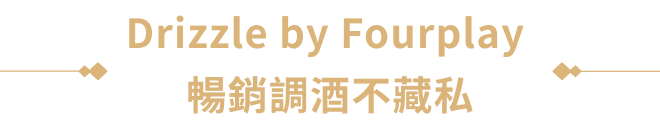 從 Fourplay 充盈著人與人之間歡愉的氛圍,到 Drizzle by Fourplay 加入了自然與人的平衡,來到 Drizzle by Fourplay ,你將從調酒中感受到食材被賦予二次價值的生命。