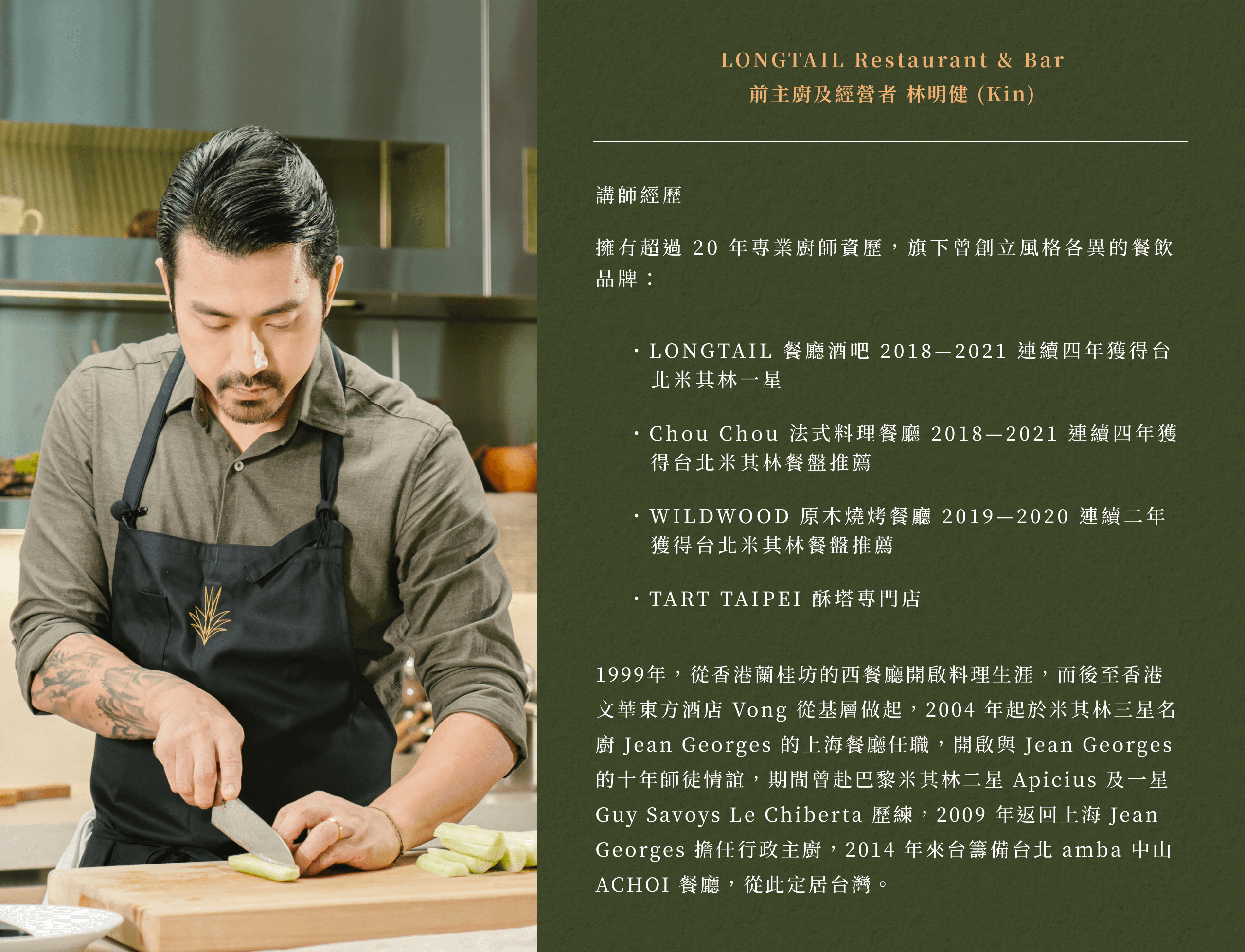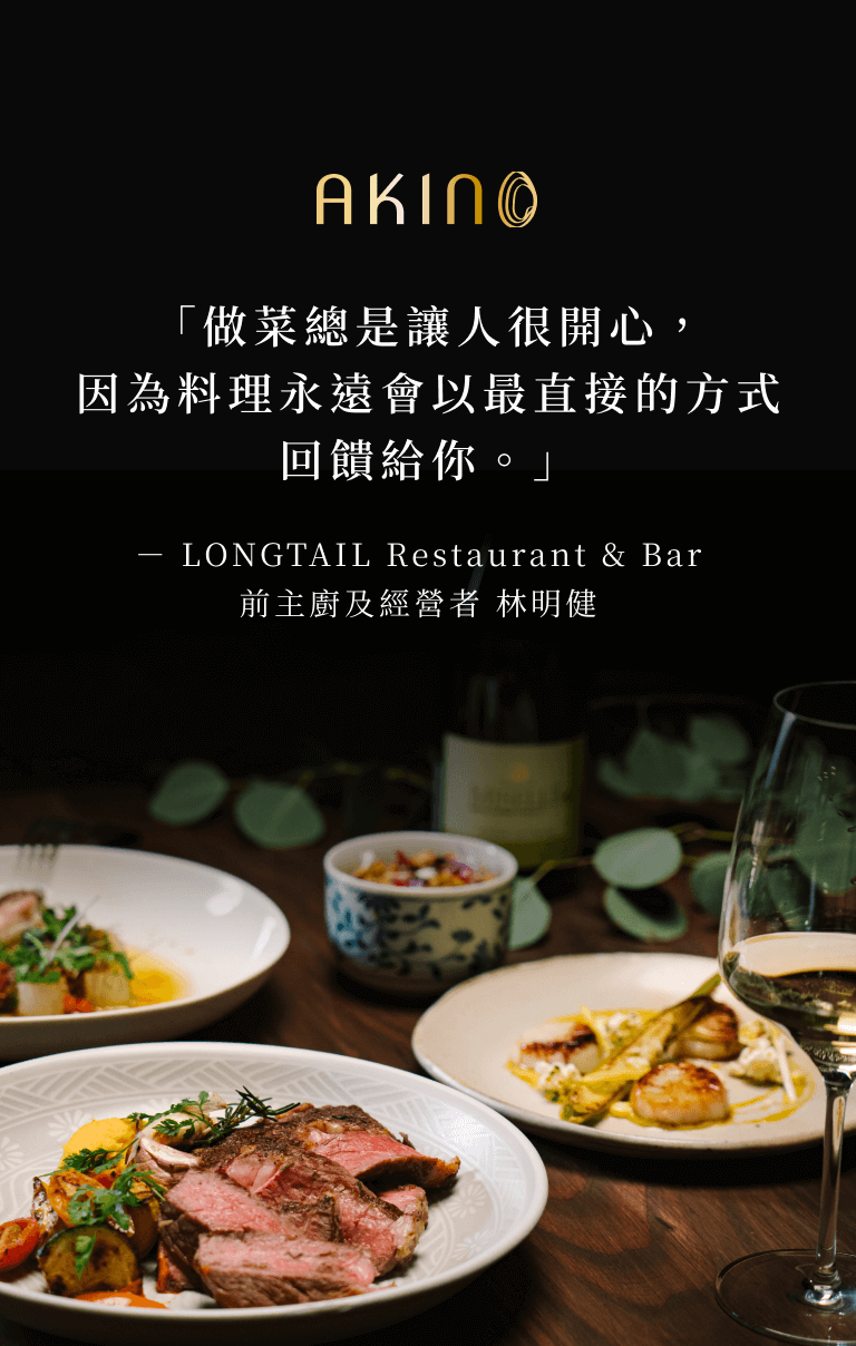 2017年,我在台灣經營LONGTAIL,將台灣與亞洲各地的食材融進我的所學所感,我所創作的料理,能夠在晚上的時光,用好一點的食材、巧妙的味道編排,來撫慰人們一天的辛勞。 LONGTAIL 出餐的地方有一個小窗口,從裡面往外可以看到用餐的客人。我最喜歡做的一件事,就是餐點送出去後,偷偷躲在小窗口後面觀察客人吃下第一口的反應,我真心希望每個人來到我店裡,無論是自己放鬆獨享或是與朋友聚會的時光,都能藉著咬下食物的每一瞬間,湧出最真實的開心、露出心滿意足的神情。