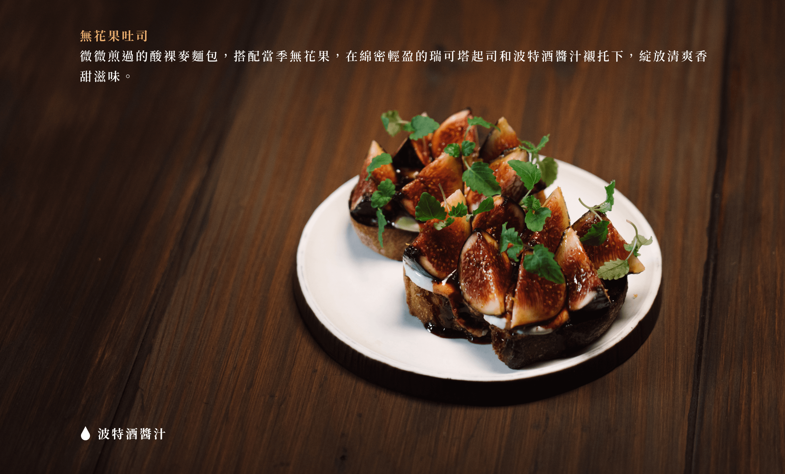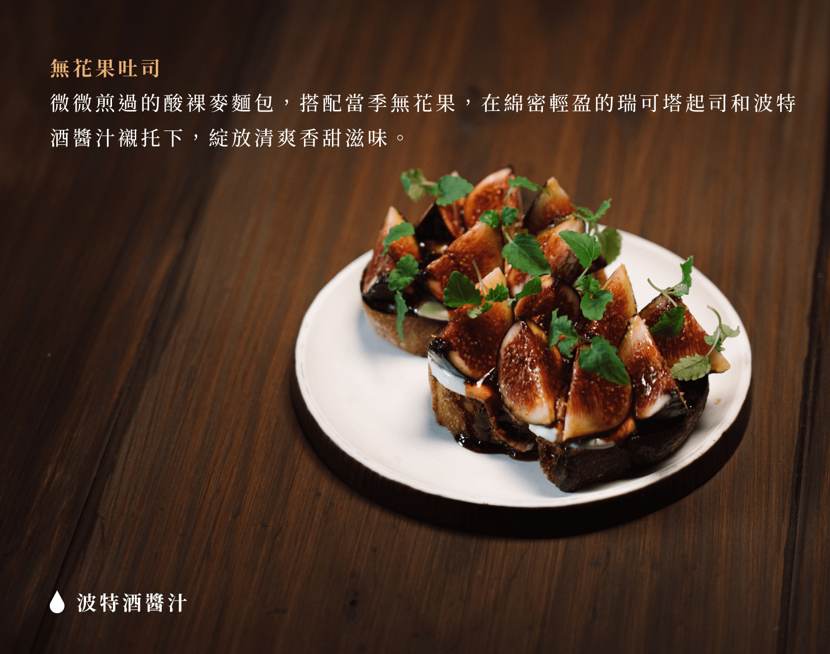 料理是初次到訪的朋友們肯定都不會錯過的招牌,奠定了這間餐廳的特色,也映照著我一路走來的料理旅程。酸甜口感平衡的無花果吐司、鮮嫩味美且清爽開胃的紅魽魚、佐搭特製風味醬料的經典牛排....,在這門課程裡,都不藏私地分享給你們。