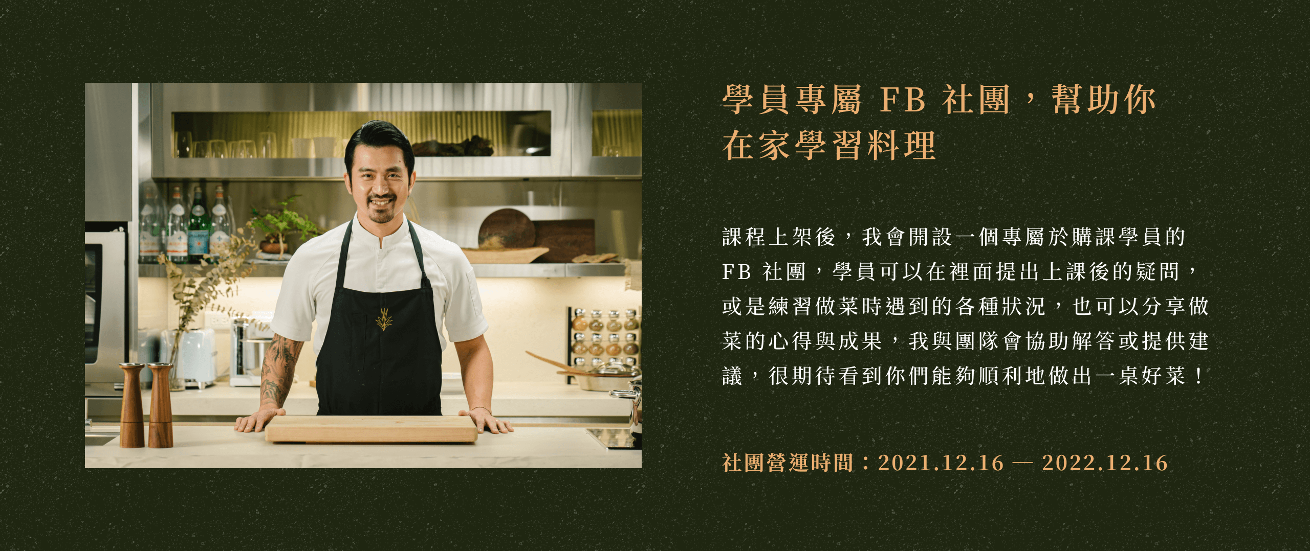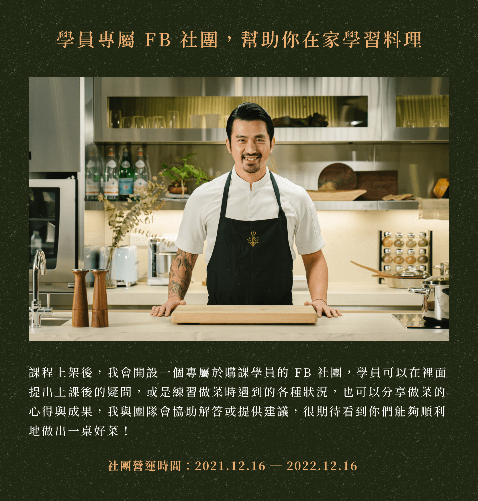課程上架後,我會開設一個專屬於購課學員的 FB 社團,學員可以在裡面提出上課後的疑問,或是練習做菜時遇到的各種狀況,也可以分享做菜的心得與成果,我與團隊會協助解答或提供建議,很期待看到你們能夠順利地做出一桌好菜!