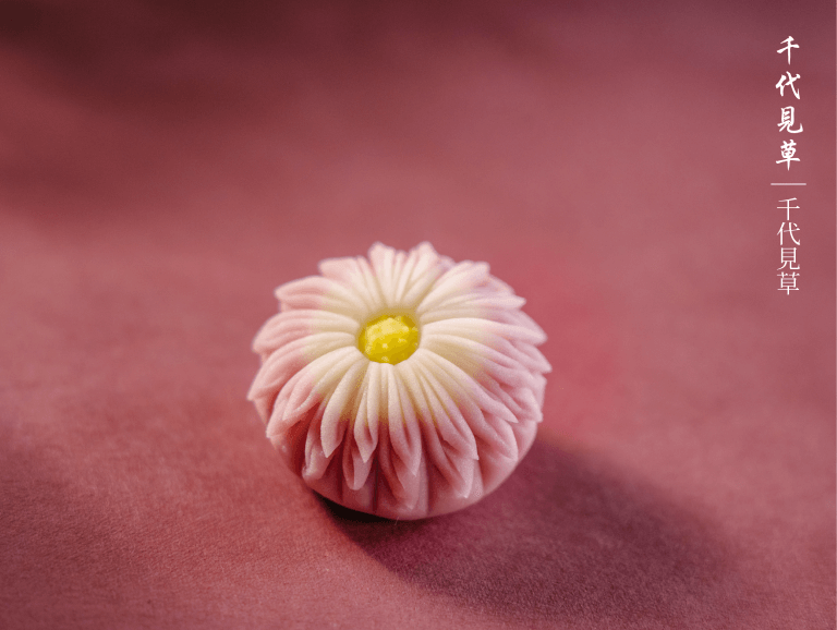 剪菊是練切上生菓子最經典的技術,依循精心的排列邏輯與顏色設計,產生絢爛的視覺變化,數大卻不雜亂。在華麗的外表之外,大型剪菊的挑戰,在於其體積為一般練切的四倍,因此需講究快而精準,以維持美味口感;同時,更需要製作者「定心」,將呼吸與思維維持在定的狀態,才能在最短時間內,行雲流水般刻畫剪菊的每一個表情與細節。