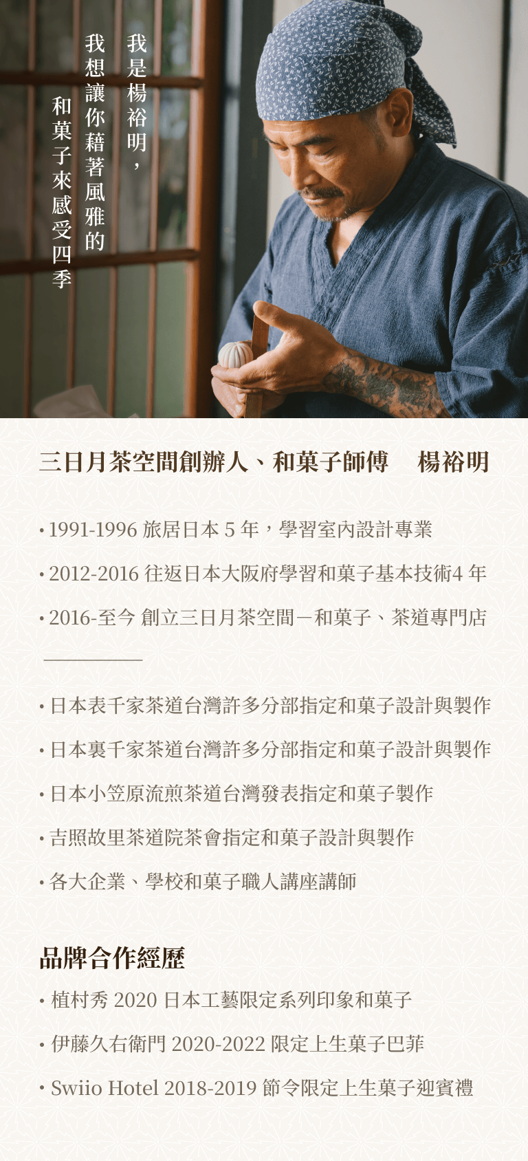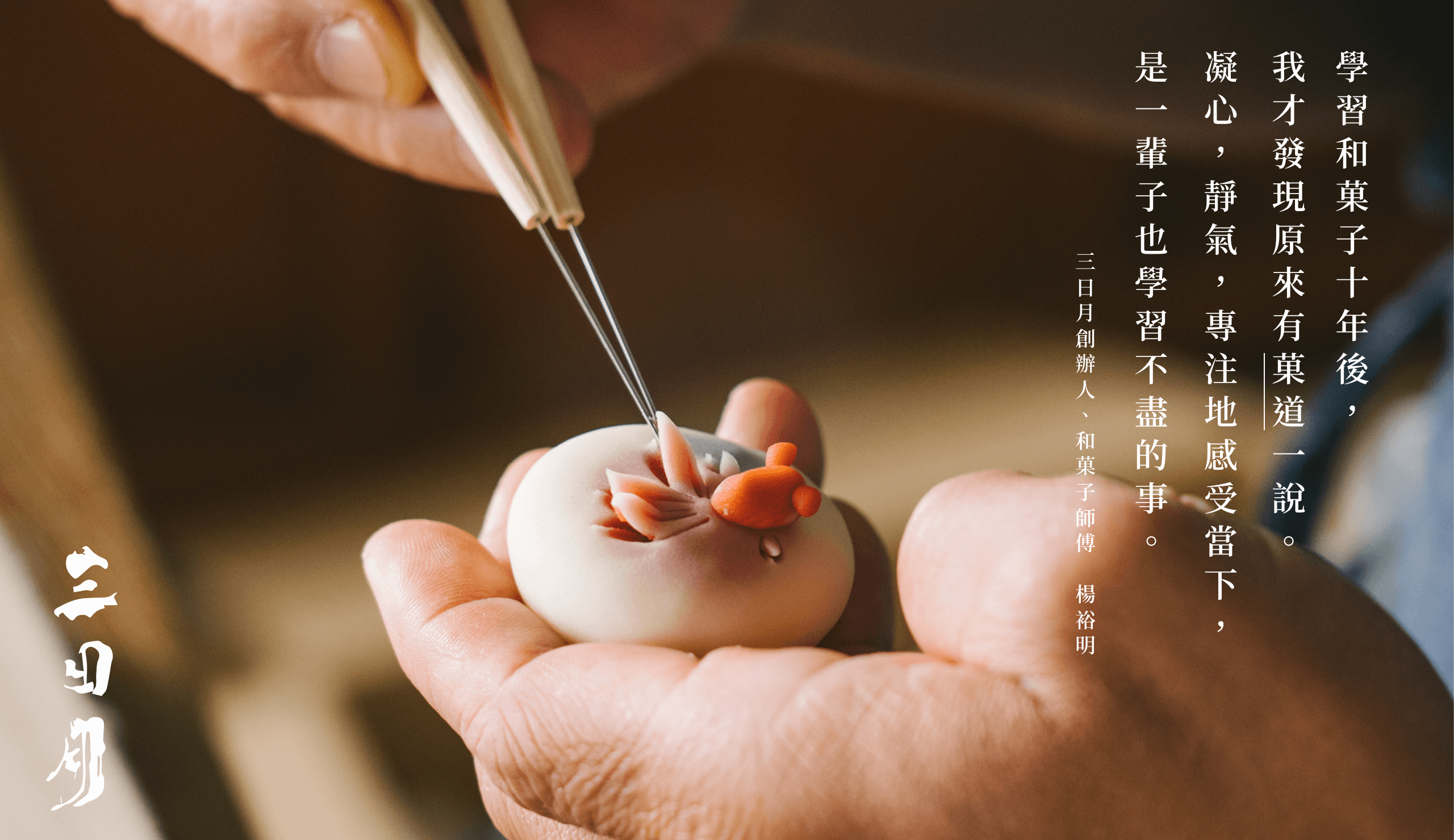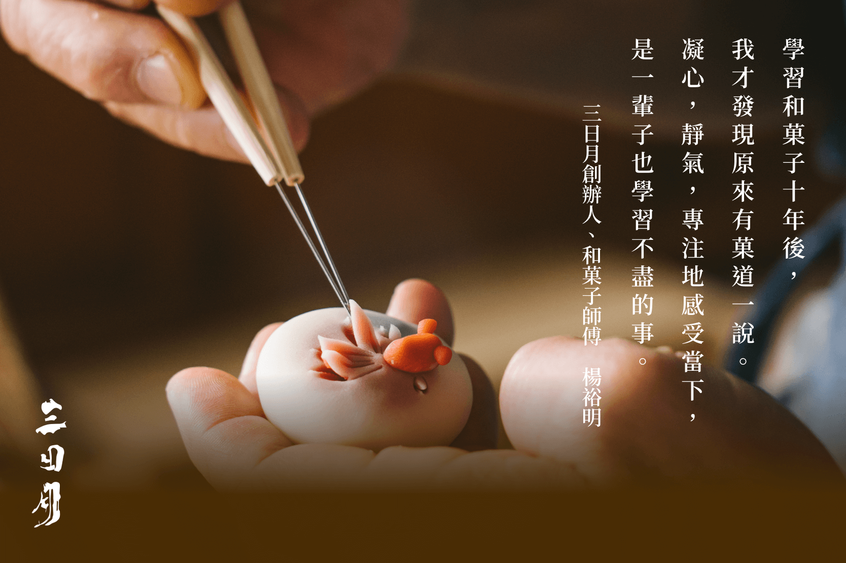 從經營三日月茶屋的第一天到現在,我的和菓子不僅保有傳統日本文化的靈魂,有著從那些職人師傅們學習到的堅毅態度與美學精神,也增添這數十年來我對自身生活的體悟與觀察,因此,每一天我都要創作一顆新的和菓子。我在口味上創新,除了傳統紅豆餡外,也開發出大眾都喜歡的口味像是洛神花、柚子等。而為了讓大眾能更熟悉、更喜歡和菓子,我也不斷開設實體課程,幫助大家輕鬆學習這些內容。這樣的堅持,讓許多日本朋友專程到我店裡購買,甚至日本的和菓子學徒也來台灣與我交流學習,並以「三日月流」和菓子表達他們對我的肯定。我想,這樣美好而靜心的事物值得我們每個人都擁有,讓我們在忙碌的世界中,藉著和菓子找到內心平靜卻又繽紛的時光。