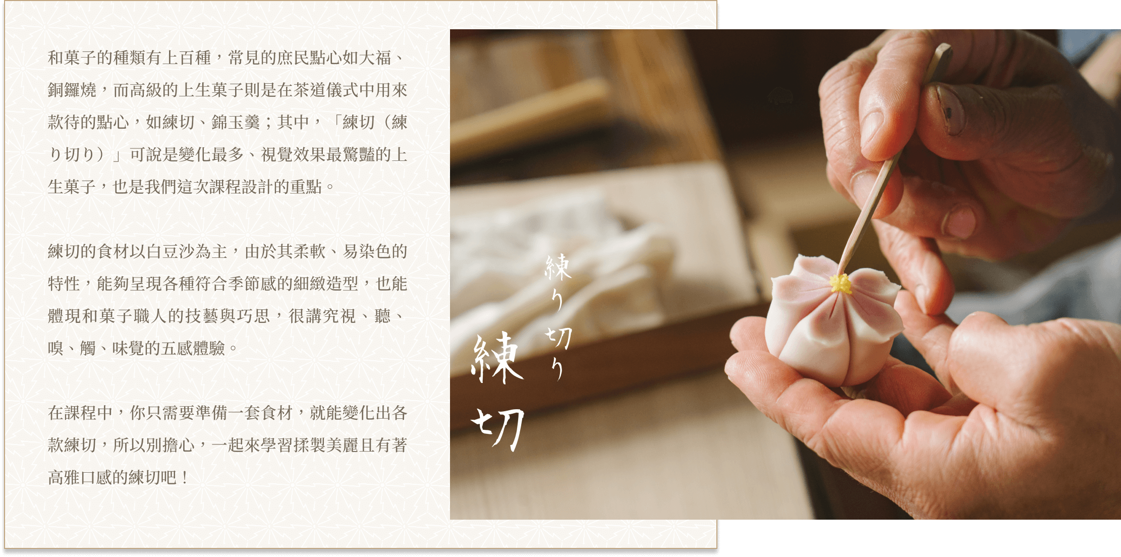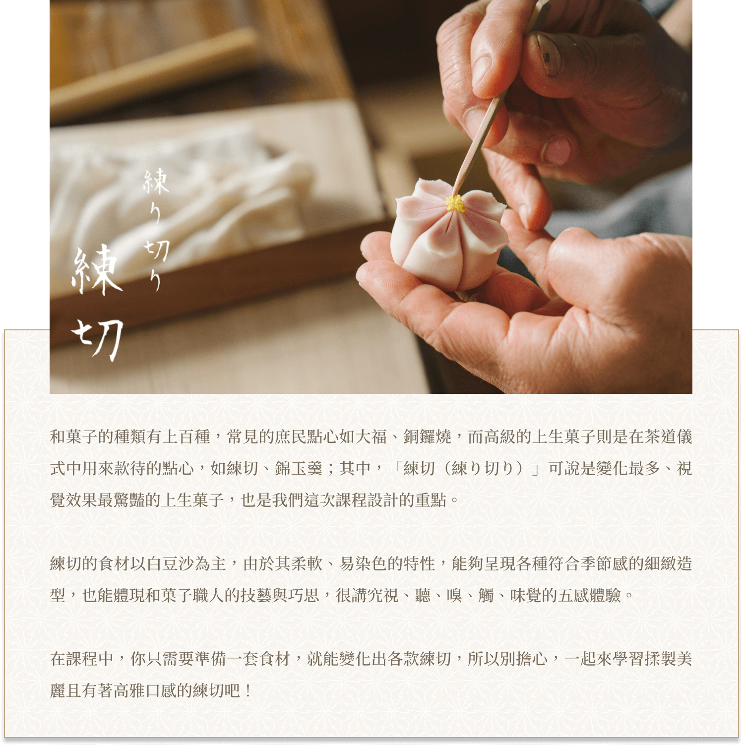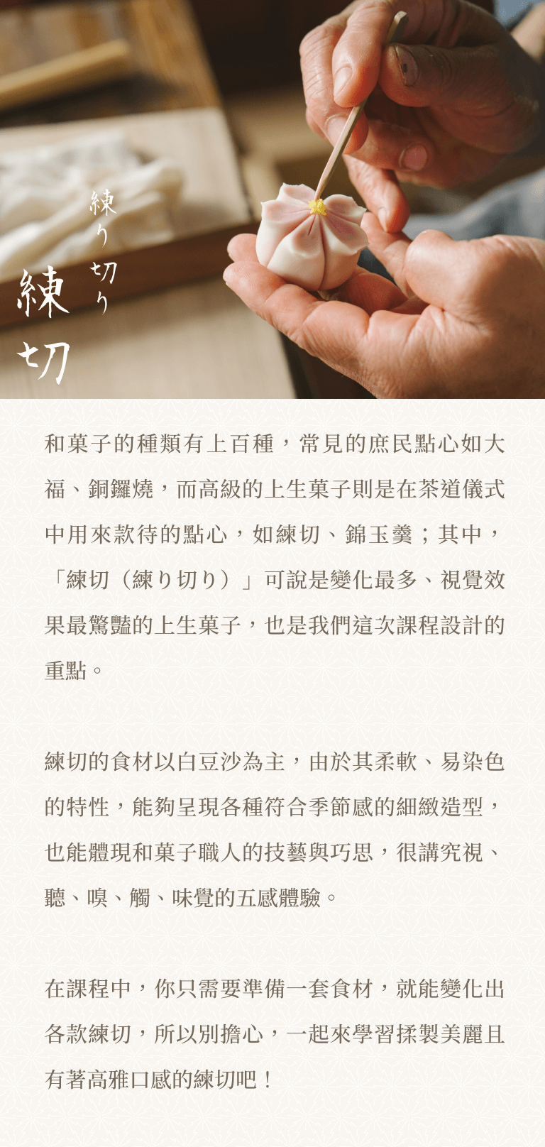 在這門課程中,我們以「練切」上生菓子作為教學重點,而練切的製作邏輯其實很單純,每一顆雖造型獨特,但內餡與外皮都是以白豆沙為主食材,換句話說,你只需要準備好一套食材,就能變化出課程教學的 24 款和菓子。