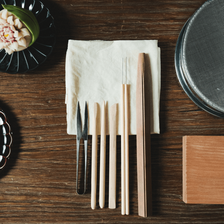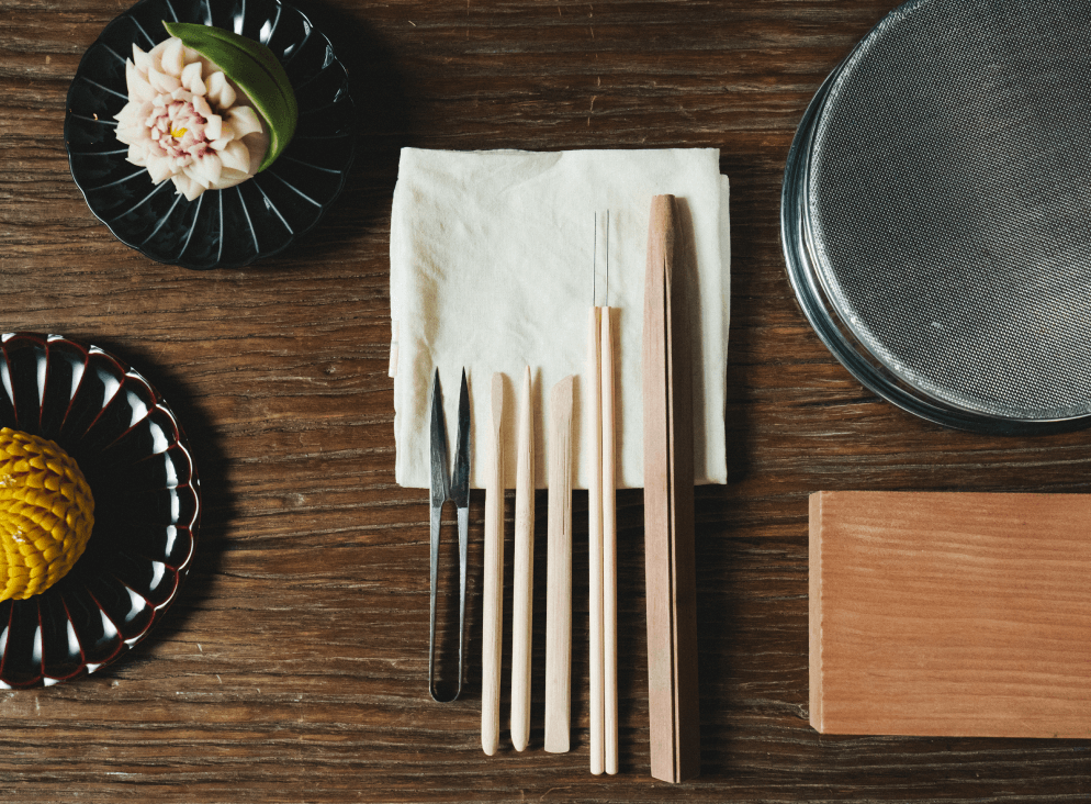 我們特地為學員準備了『和菓子基礎工具組』,包含經典的菊芯三角棒、丸棒、竹刀,以及較不容易取得的木雞蛋、竹刷, 課程中絕大部分練切和菓子,透過這些經典基礎工具即可完成!