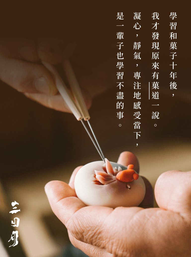 2012 年的台灣,很難找到專業製作和菓子的店家與師傅,所以我到日本拜師學藝,前後花了四年的歲月。和菓子是為了茶而生,與日本的茶道文化相輔相成。日本民族藉著茶道與和菓子,表達他們對於四季、對於生活變化的細膩觀察,而季節的流轉也會因為我們心境不同,而有不同的感受。這都讓此時此刻的「當下」顯得格外珍貴,我們每一天碰到的人、事、物亦是剎那間的永恆,於是有了「一期一會」的說法。我們能做的就是靜下心來,很有意識地感受這世界,而這樣也才能讓我們生命變得更厚重而有韻味。