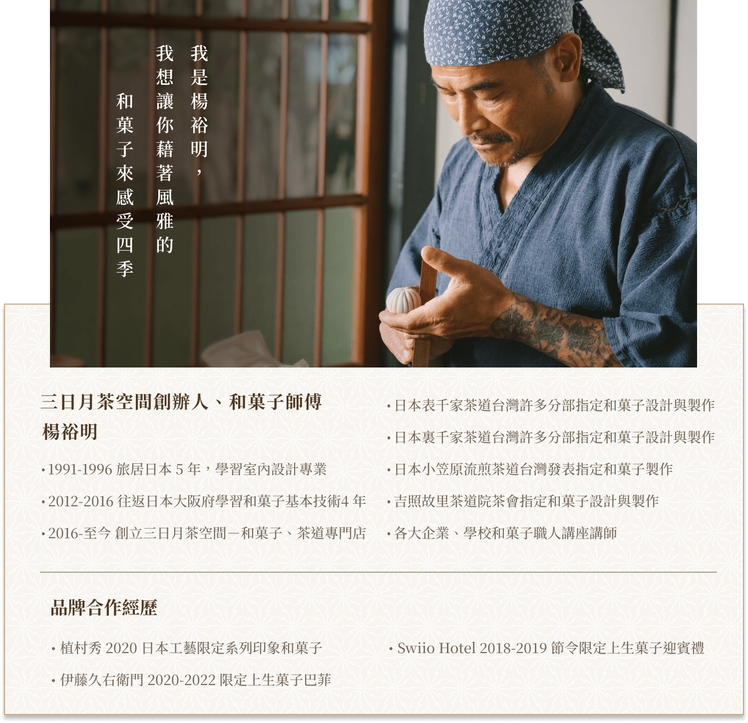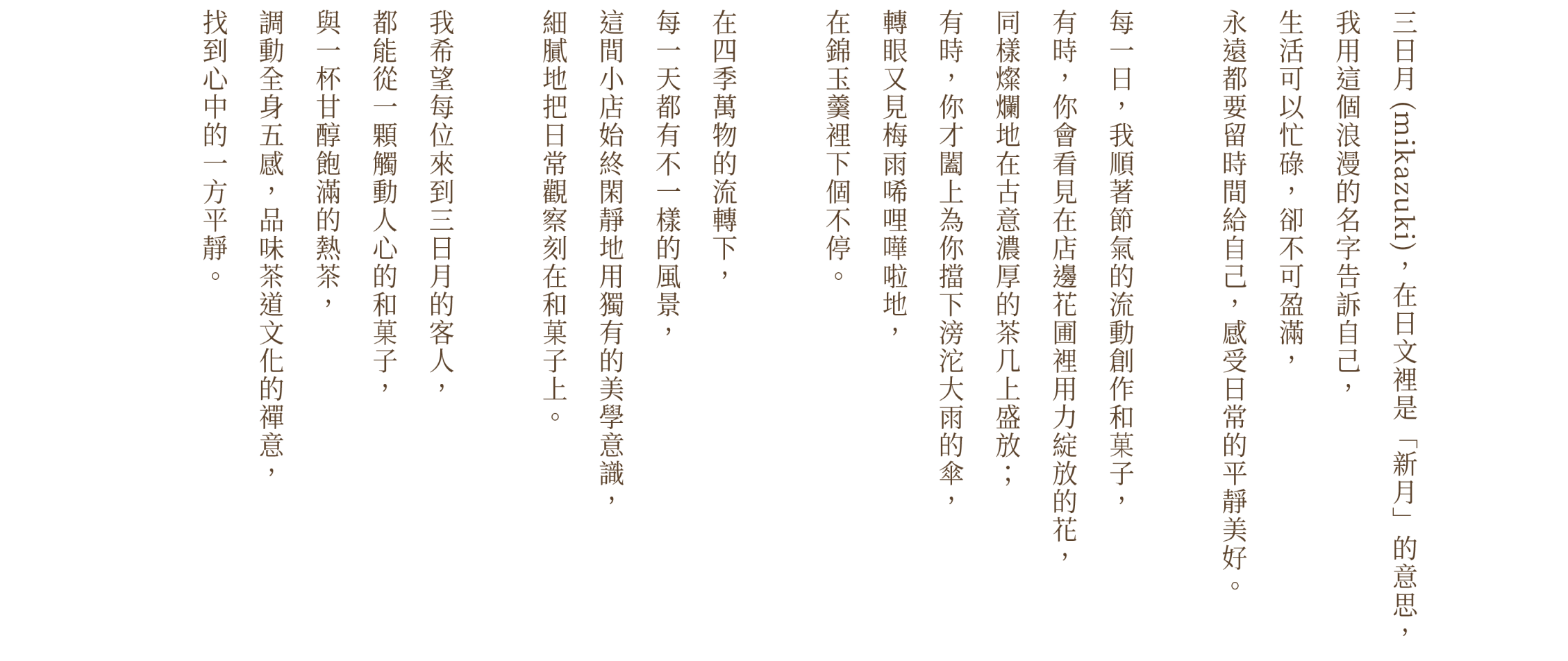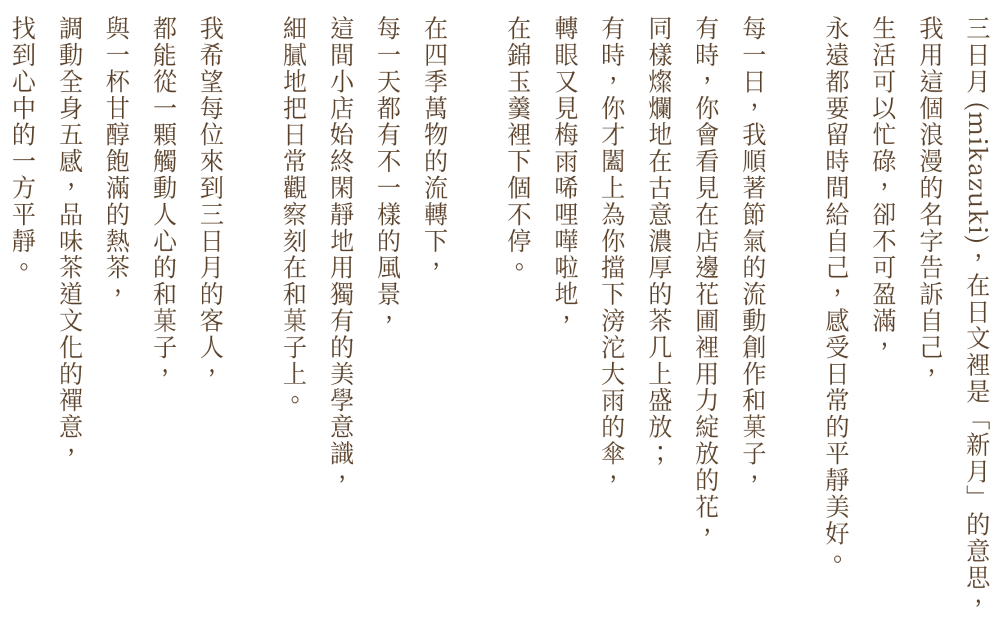 我希望每位來到三日月的客人,都能從一顆觸動人心的和菓子,與一杯甘醇飽滿的熱茶,調動全身五感,品味茶道文化的禪意,找到心中的一方平靜。