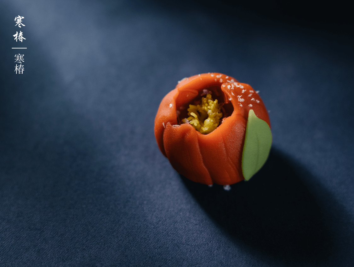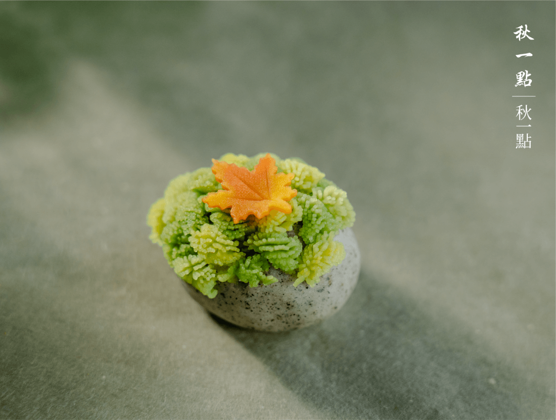 我喜歡這樣的儀式感,或者說,這樣品味生活反而多了一種浪漫。 我想起自己年少到日本半工半讀,第一次看到大雪紛飛中綻放的茶花而流下想家的眼淚,後來我將這段回憶化成靈感做出和菓子「寒椿」;記得造訪京都的琉璃光院、漫步在戶外日式庭園時,一片焰紅的楓葉恰好不疾不徐地落在青苔石上,那樣的輕巧安靜把我的心都抓進到它們的世界裡,也就有了和菓子「秋一點」。