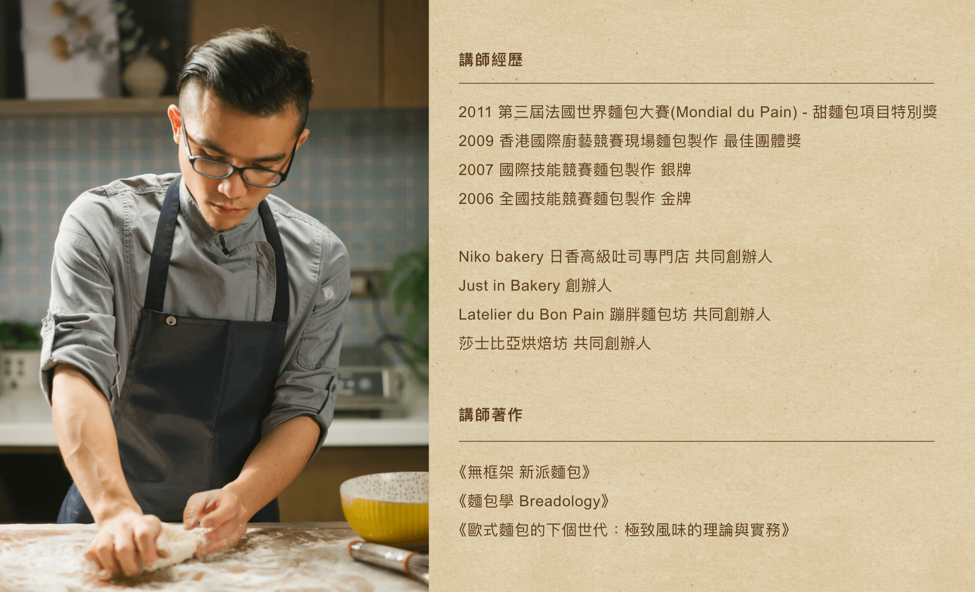 在坊間,想要學到扎實的麵包知識與概念真的不容易。大部分的朋友都是直接買一本書籍,可惜大多是只提做法,沒有說到來龍去脈;或者書籍是外語的內容,許多對外語較吃力的朋友就很難掌握核心基礎理論。我們自己圈內人過往學習的脈絡,大多是當學徒跟在師父旁邊學習、提問,可是很多時候師傅做麵包的步驟跟細節,往往也只是前人教導的工作習慣,沒有探究根本原因,所以對於想要嘗試改變的人來說,會不知道從何下手。因此,我把做麵包這些年來的經驗,參考非常多外國書籍與理論知識後,出了一本麵包學的書籍,方便大家可以更有系統性的理解與學習。在這門課,我也會用這樣的精神,以白話文的方式分享給大家,讓大家不僅可以做出麵包,更能打好自己烘焙的基礎知識,未來想要進修或是創意發想改良麵包作品,都能有清晰的思考脈絡,觸類旁通。我迫不及待想要讓大家了解麵包世界的樂趣。