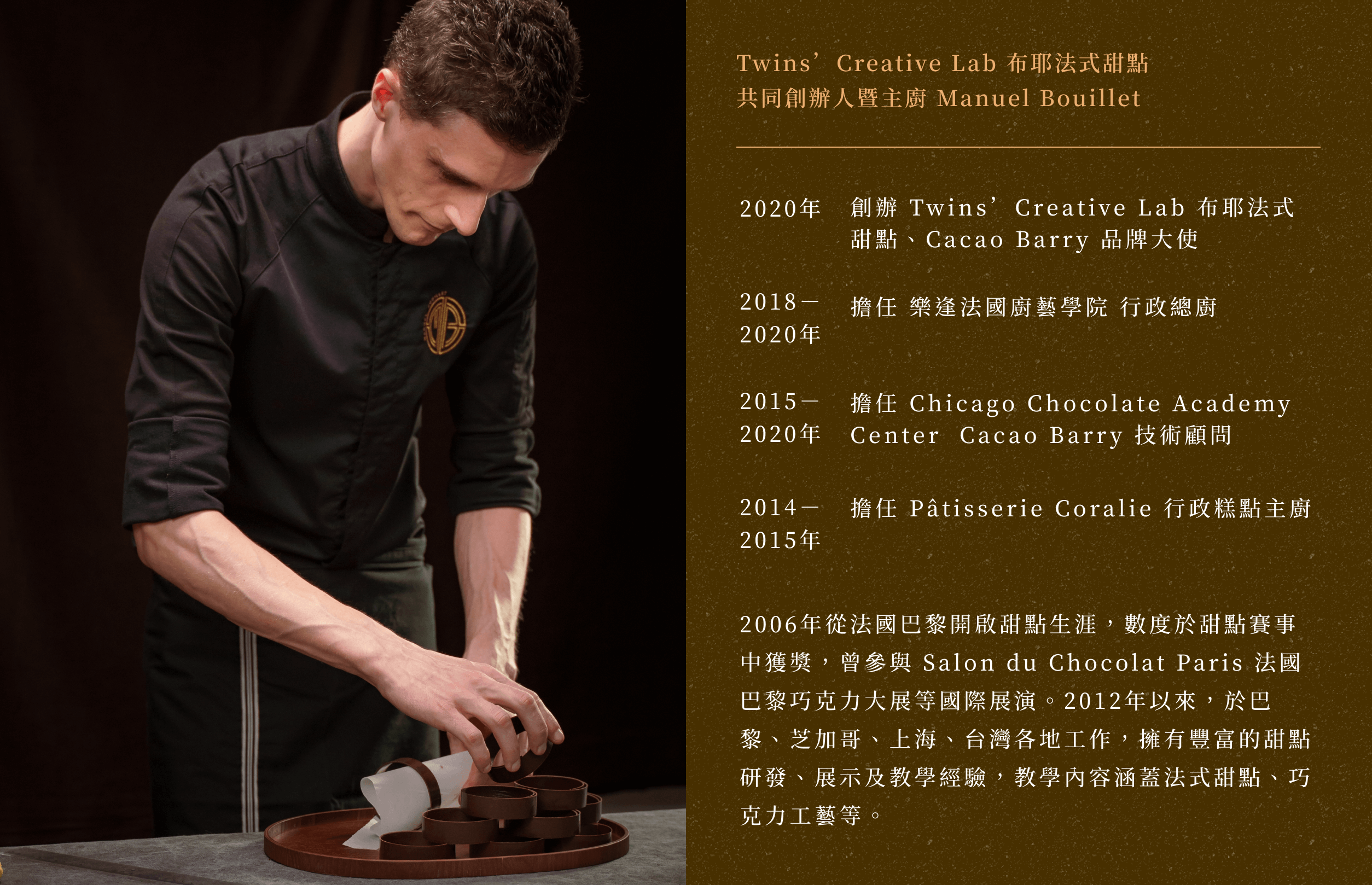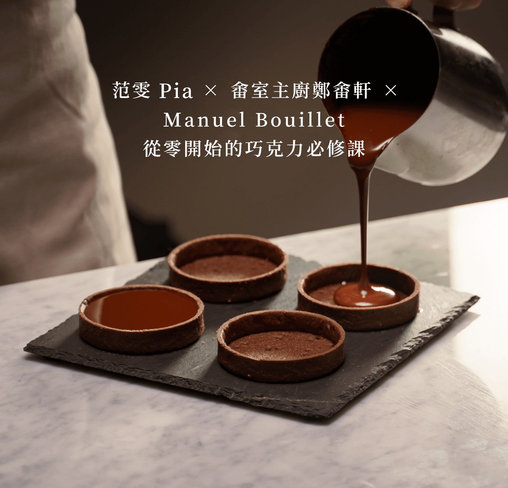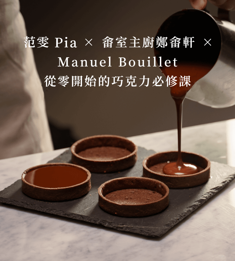 此外,我也邀請了和我一樣與巧克力有著獨特而深刻連結的兩位主廚,分別是台灣 bonbon 巧克力指標——畬室的鄭畬軒主廚,與曾為知名巧克力品牌 Cacao Barry 技術顧問的法國主廚 Manuel Bouillet,一起分享他們與巧克力的相遇。在課程中,我們會一步步帶著你深入理解巧克力的風味搭配,藉著多款私藏甜點一起探索巧克力在法式甜點中的多種運用,感受巧克力在口中細緻豐富的質地與滋味變化。