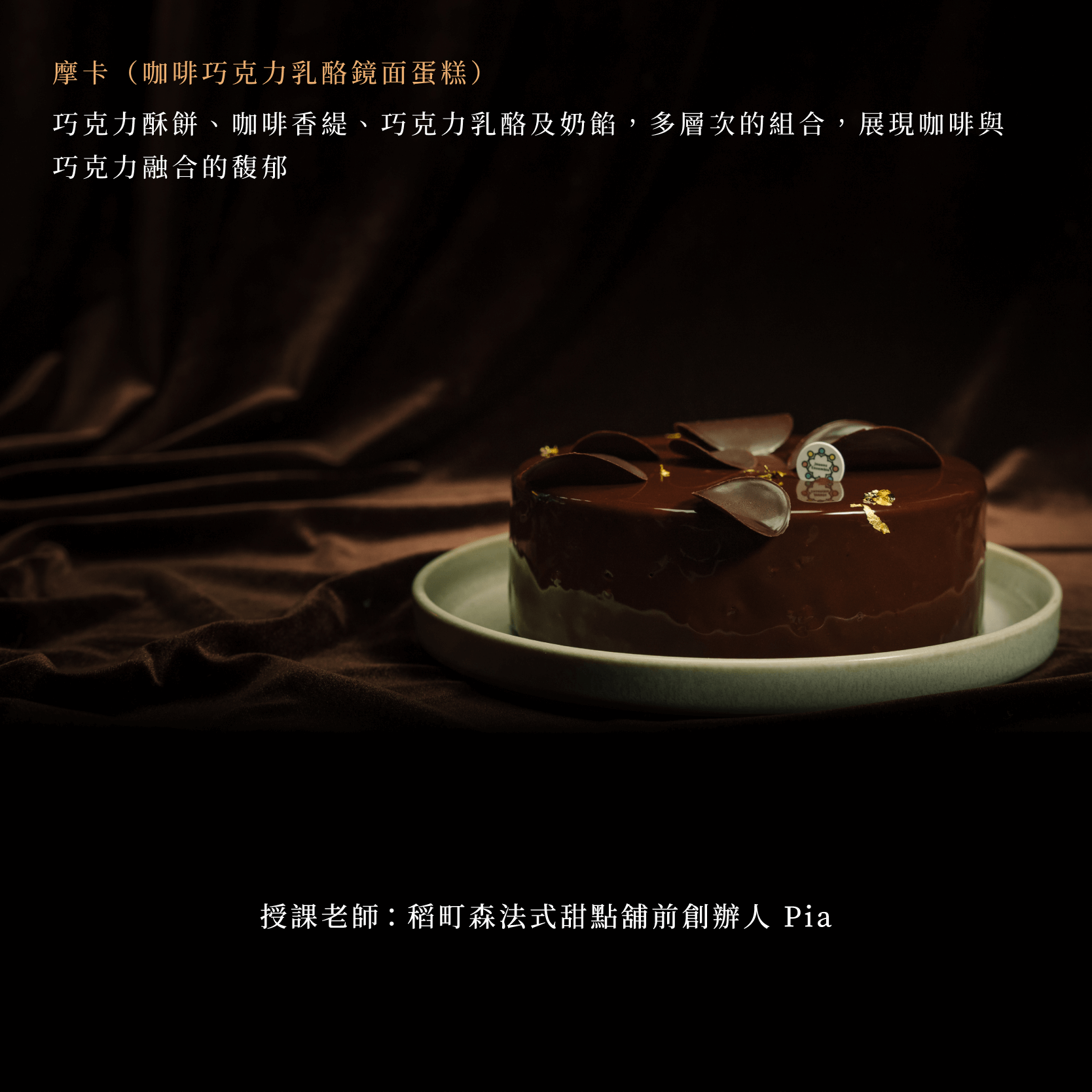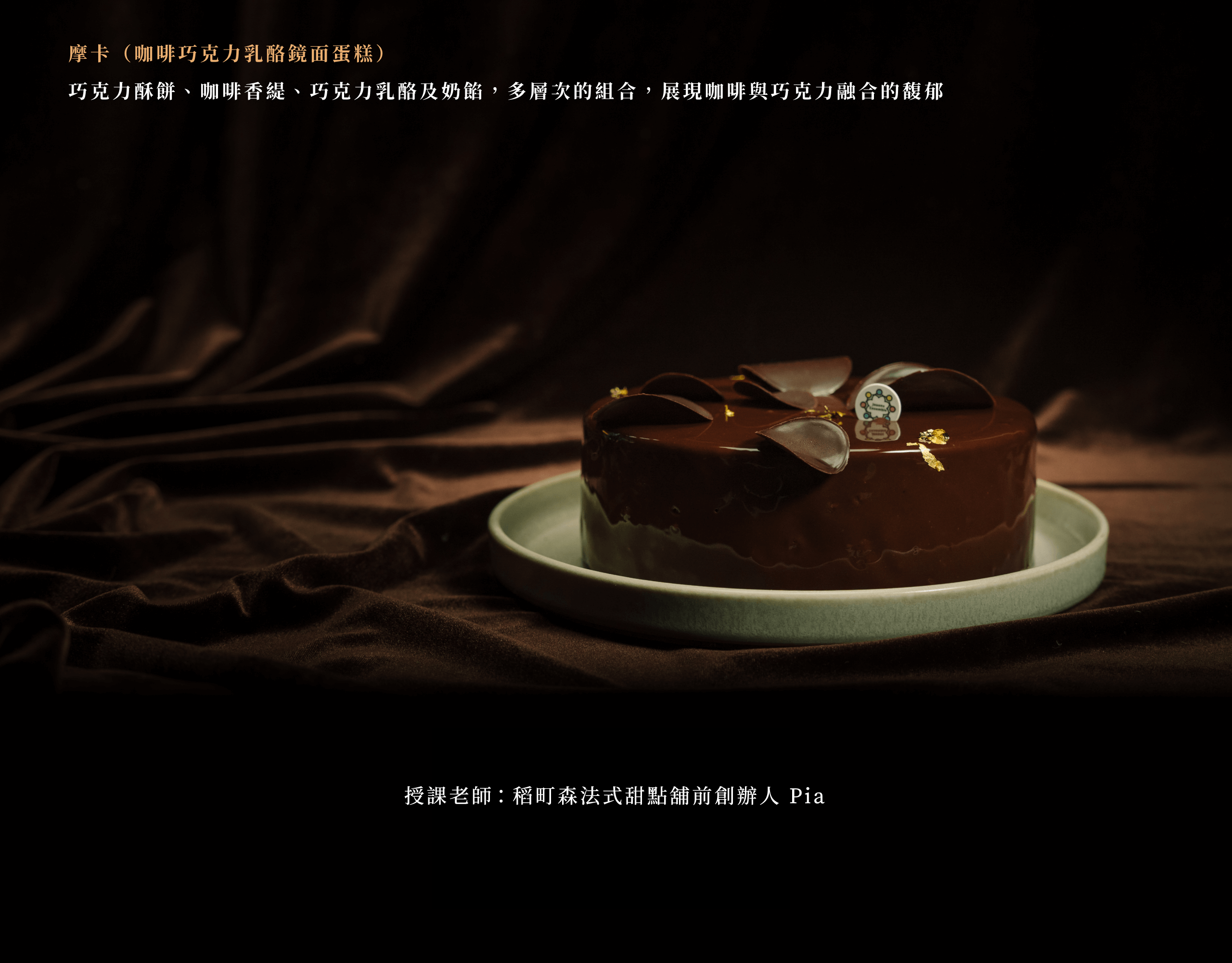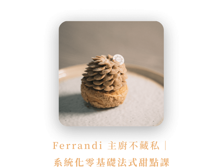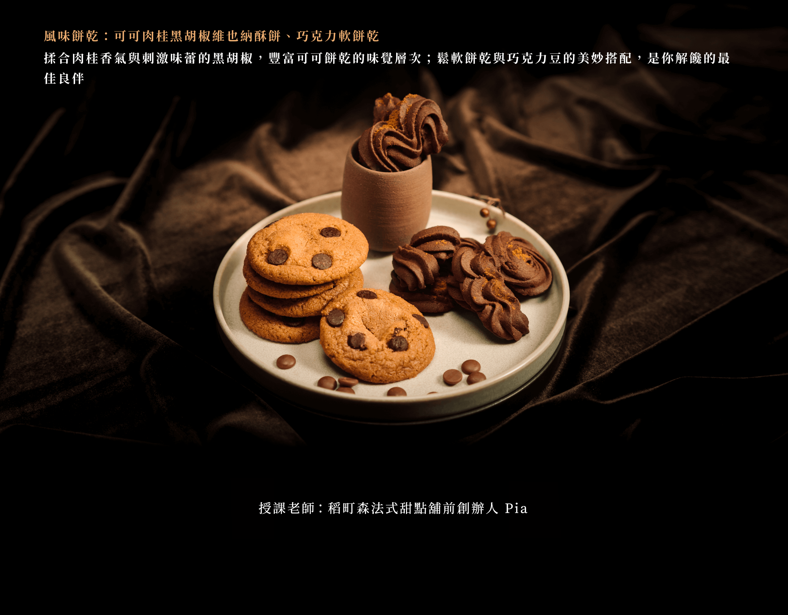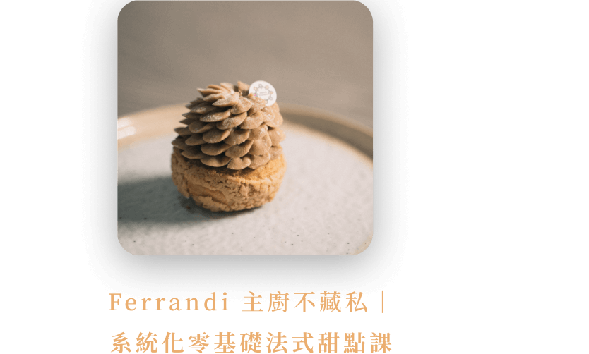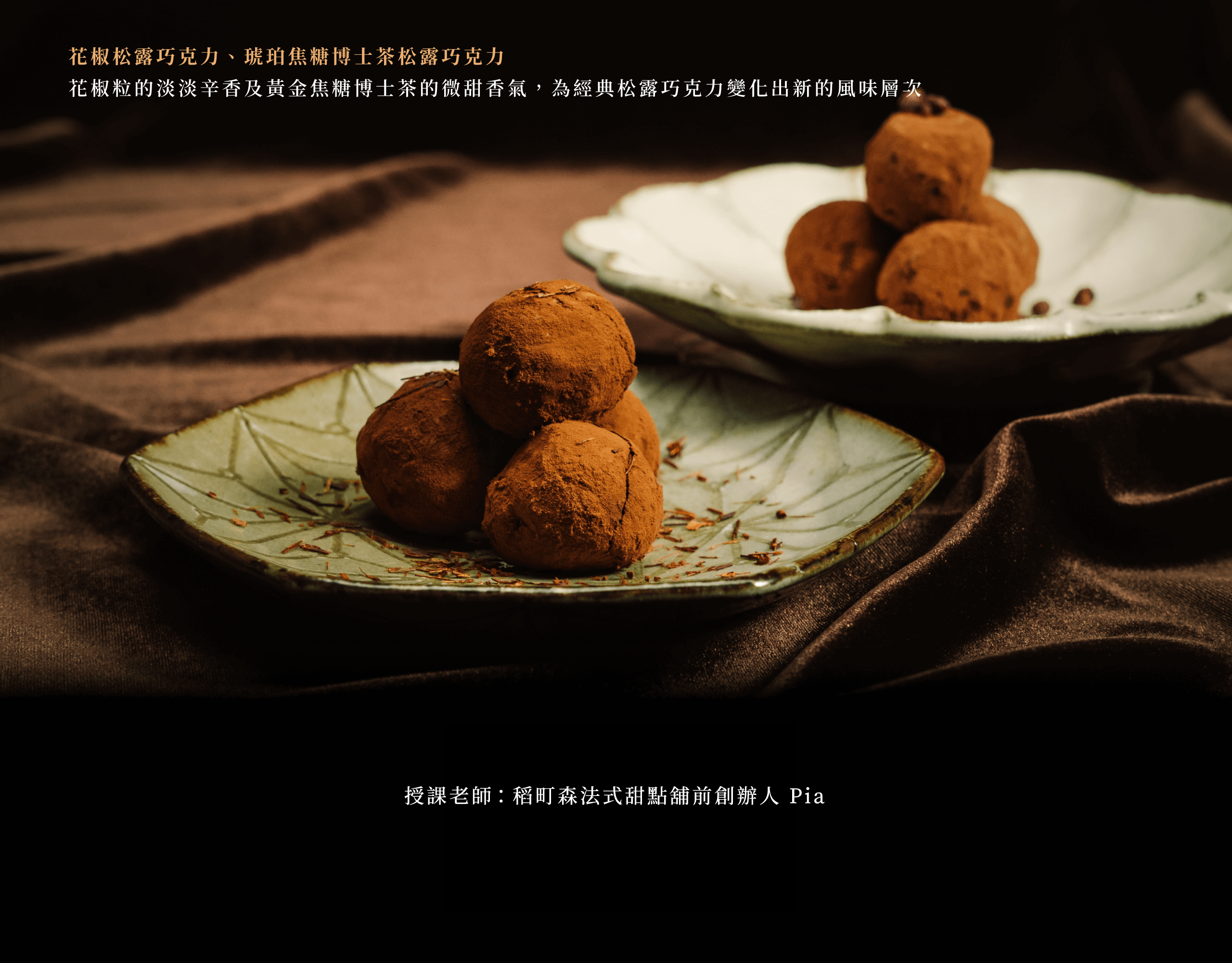 這次課程精選了「巧克力」、「巧克力麵包」與「巧克力甜點」三大類別,共計 11 種巧克力應用品項,分別包含松露巧克力、兩款維也納系列麵包:布里歐許、可頌,巧克力甜點則涵蓋餅乾、泡芙、塔、可麗餅千層、夏洛特蛋糕、鏡面蛋糕、樹幹蛋糕與調溫飾片,你可以完整學會巧克力在法式甜點中的核心技法與應用!