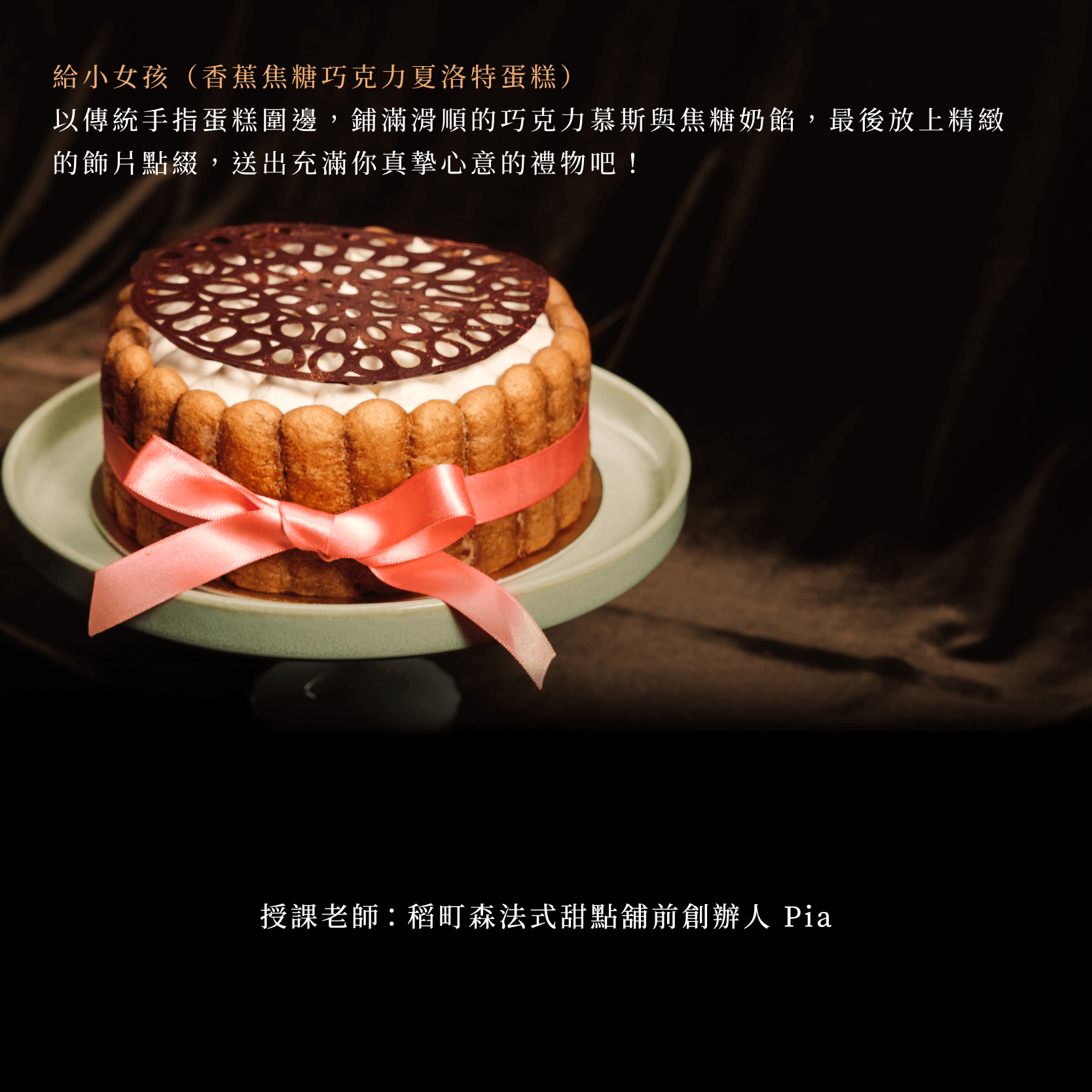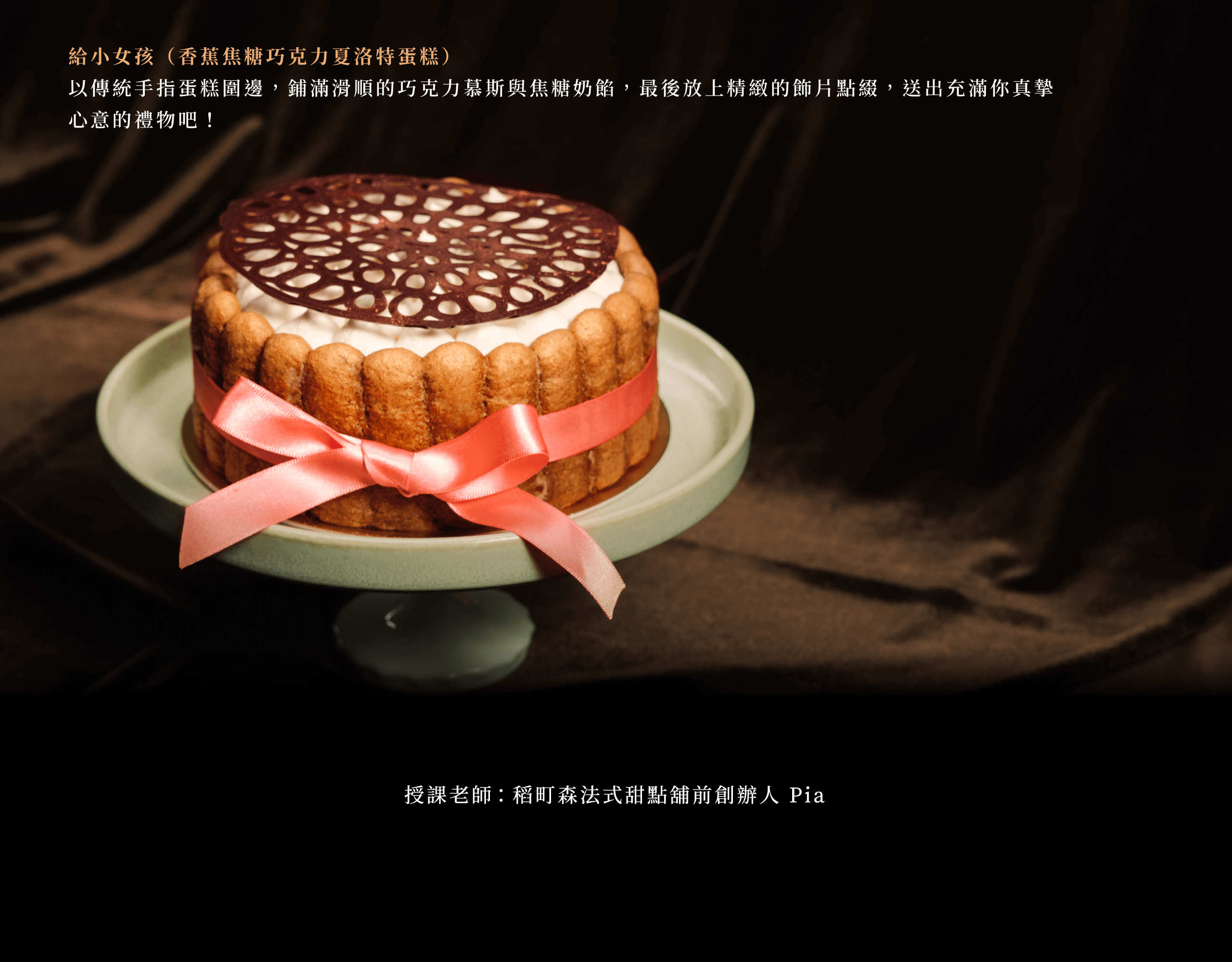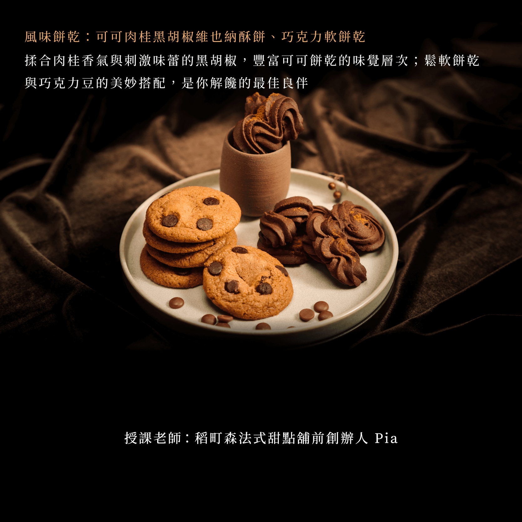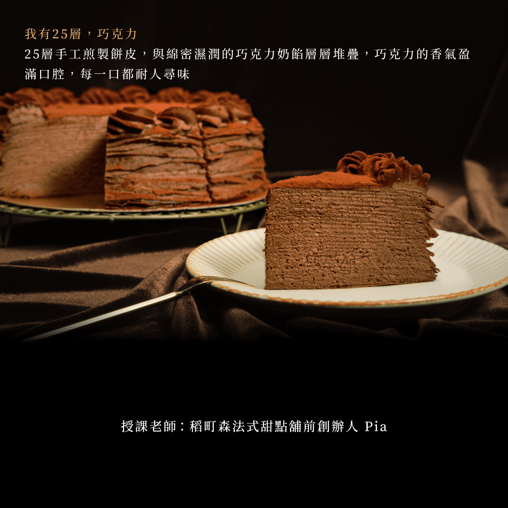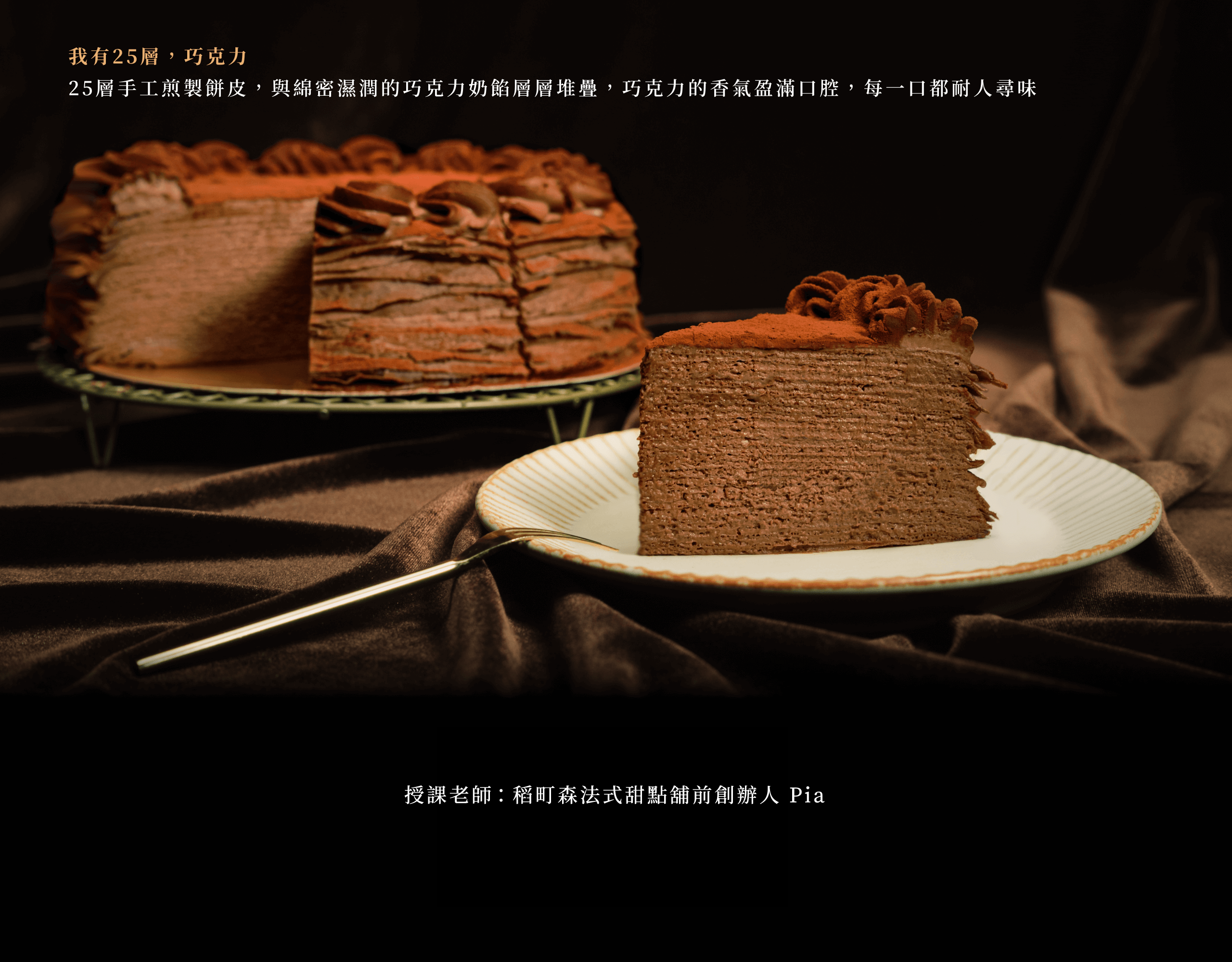 這次課程精選了「巧克力」、「巧克力麵包」與「巧克力甜點」三大類別,共計 11 種巧克力應用品項,分別包含松露巧克力、兩款維也納系列麵包:布里歐許、可頌,巧克力甜點則涵蓋餅乾、泡芙、塔、可麗餅千層、夏洛特蛋糕、鏡面蛋糕、樹幹蛋糕與調溫飾片,你可以完整學會巧克力在法式甜點中的核心技法與應用!