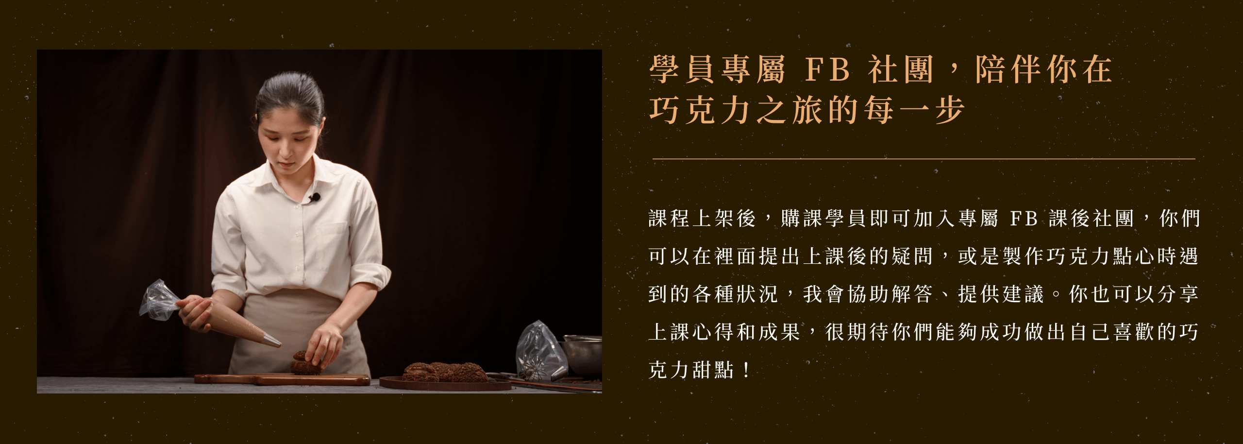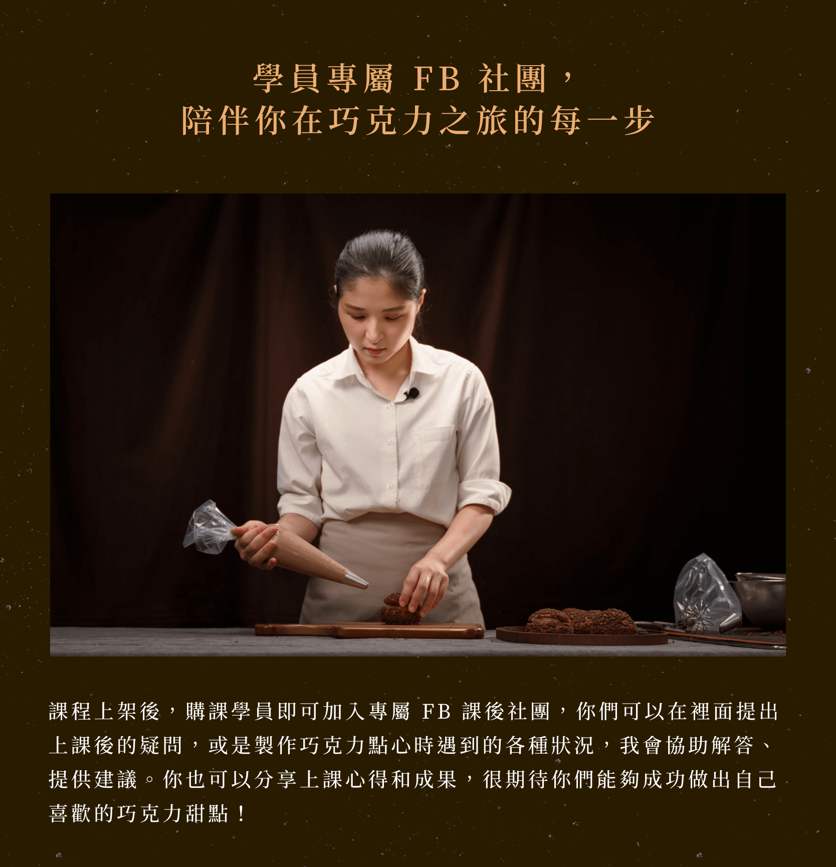 課程上架後,購課學員即可加入專屬 FB 課後社團,你們可以在裡面提出上課後的疑問,或是製作巧克力點心時遇到的各種狀況,我會協助解答、提供建議。你也可以分享上課心得和成果,很期待你們能夠成功做出自己喜歡的巧克力甜點!