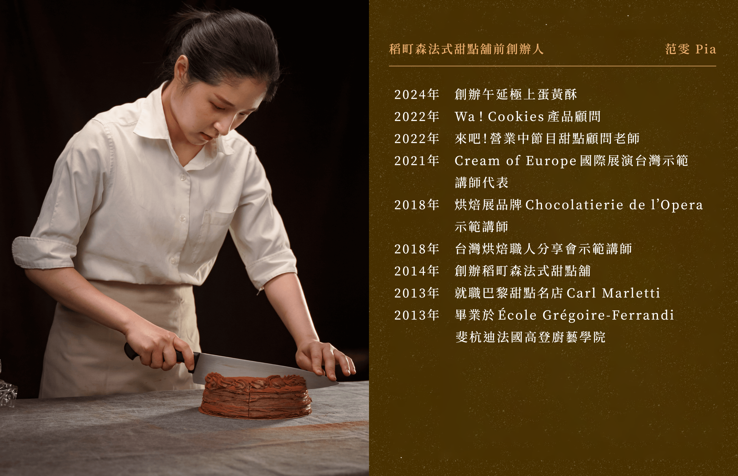 2006年從法國巴黎開啟甜點生涯,數度於甜點賽事中獲獎,曾參與 Salon du Chocolat Paris 法國巴黎巧克力大展等國際展演。2012年以來,於巴黎、芝加哥、上海、台灣各地工作,擁有豐富的甜點研發、展示及教學經驗,教學內容涵蓋法式甜點、巧克力工藝等。