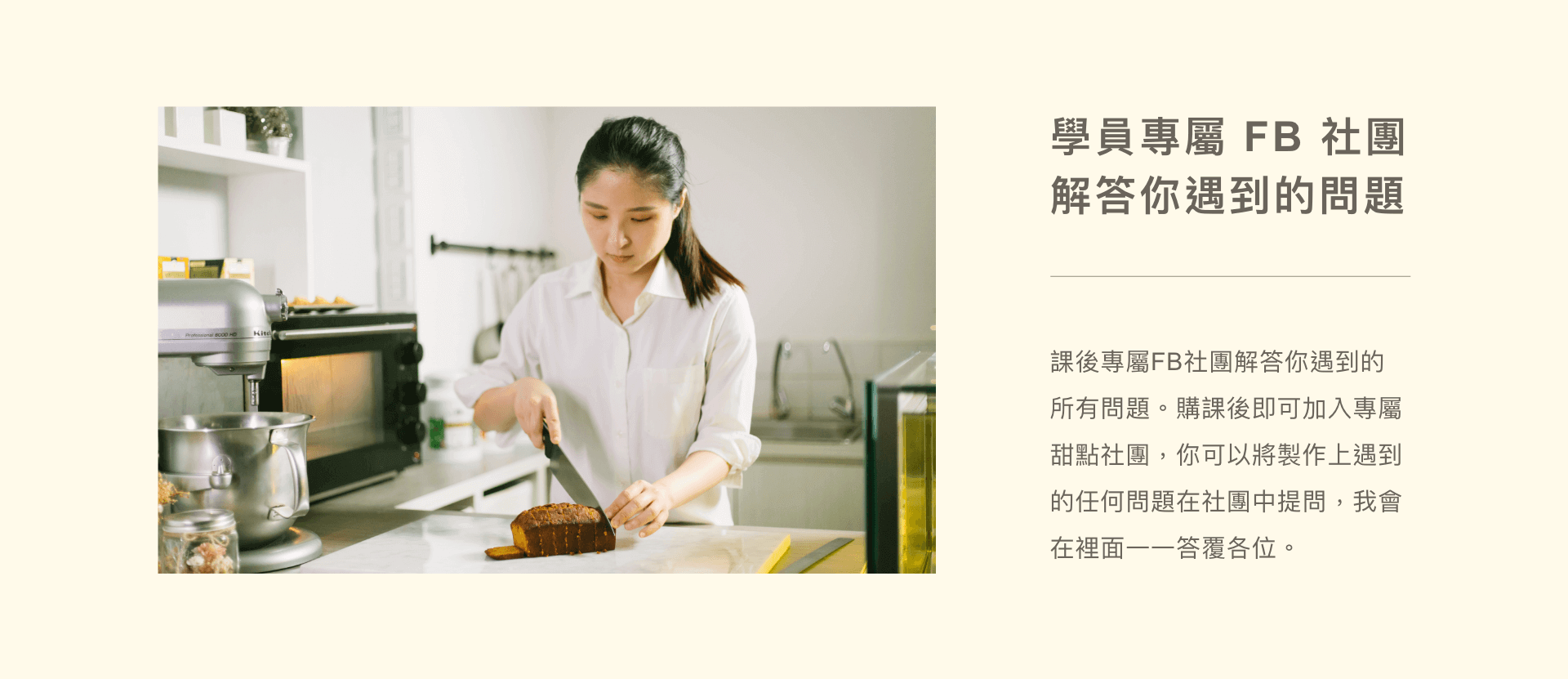 課後專屬FB社團解答你遇到的所有問題。購課後即可加入專屬甜點社團,你可以將製作上遇到的任何問題在社團中提問,我會在裡面一一答覆各位。