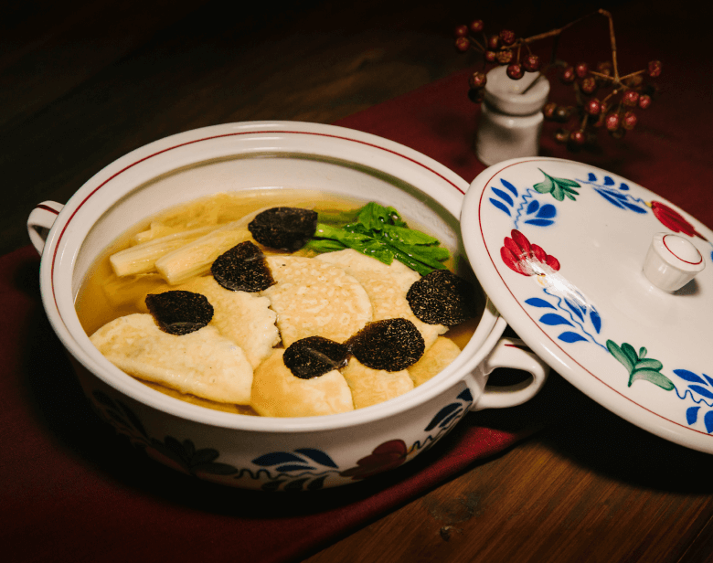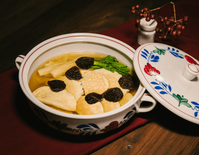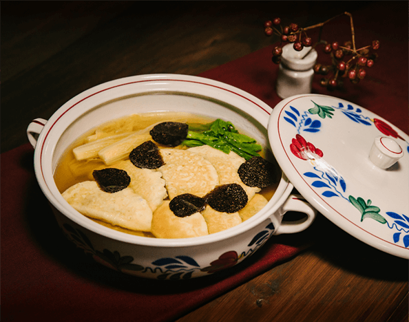 則會帶來一道適合過年的創意料理,他最喜歡的蛋餃,搭配溫暖的法式澄清湯。每一道料理都融匯了我們對於相聚的記憶,以及料理之路上的學習,希望你們喜歡。