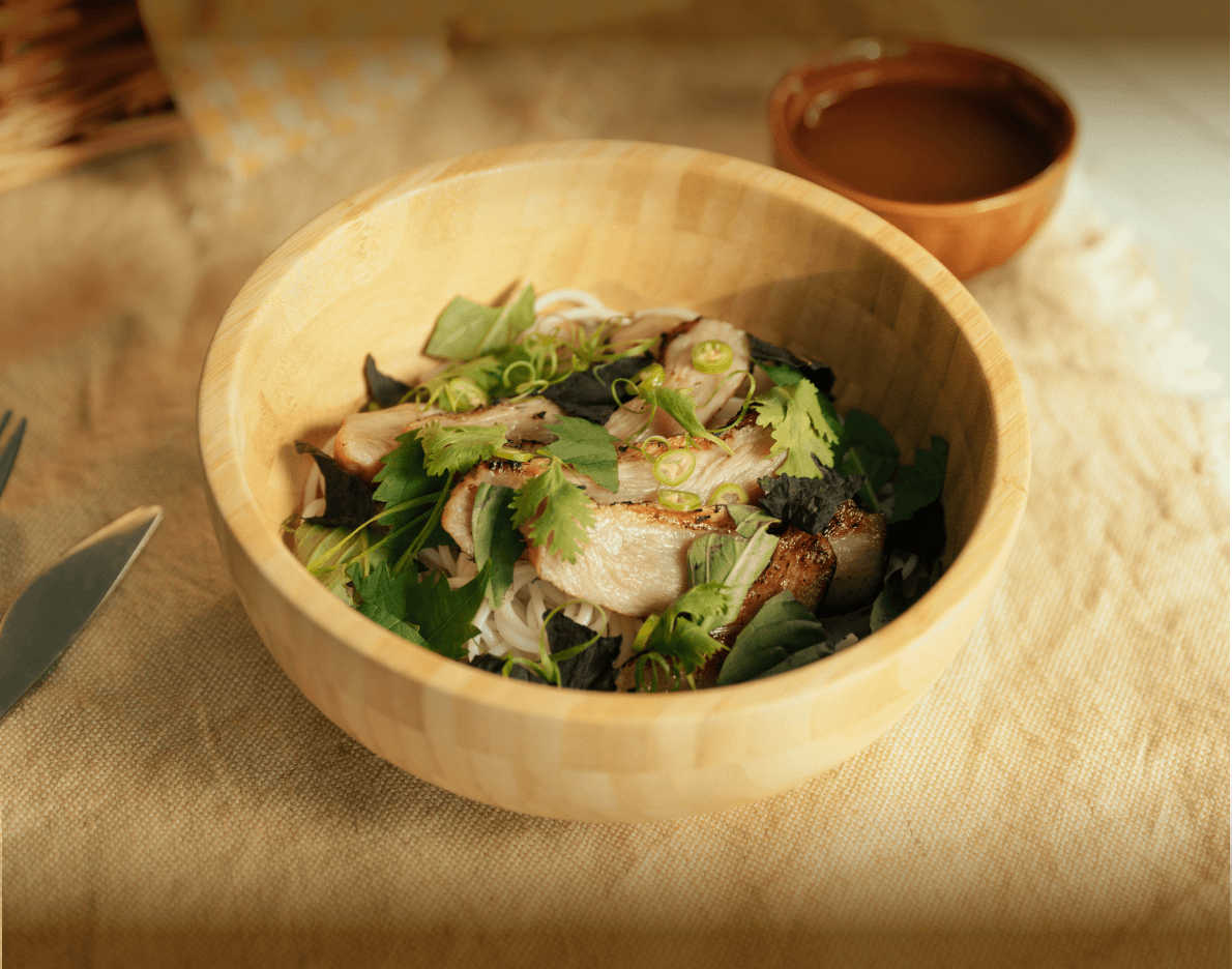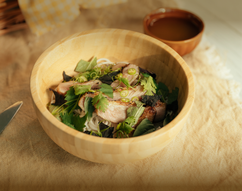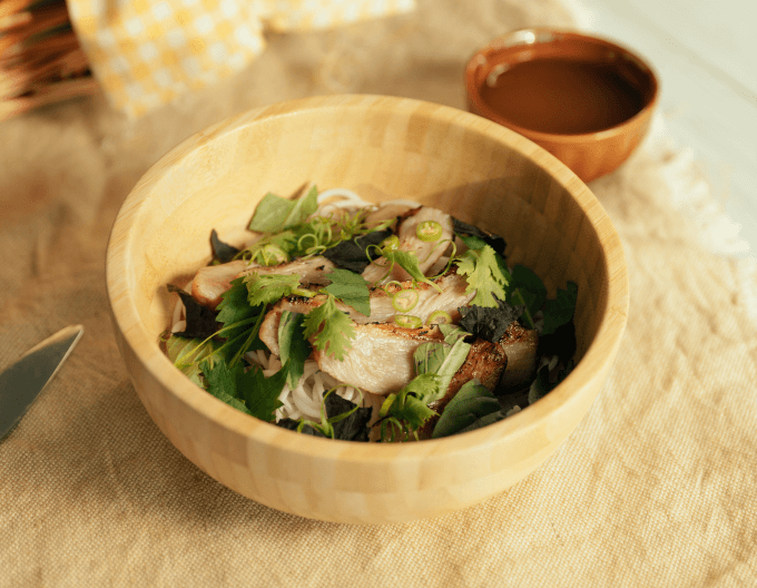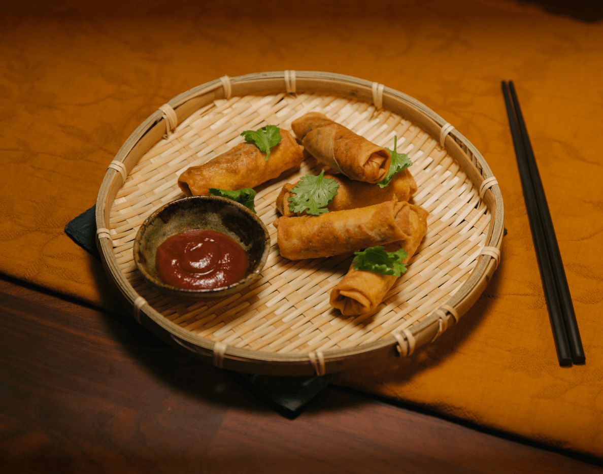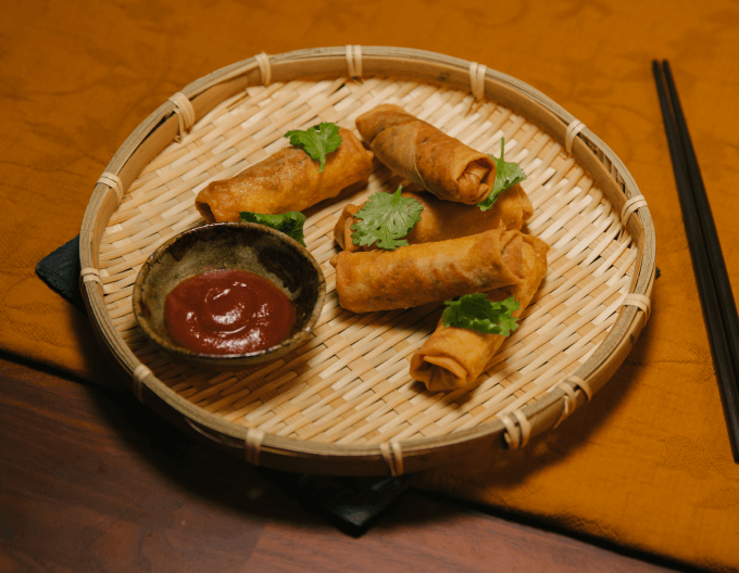 我從越式經典的米紙卷出發,但是內餡改包入大量新鮮蔬菜和蕈菇,半透明的紙卷下隱隱透出鮮綠色澤,賞心悅目又勾起食慾。送入口中,你可以一次感受到米紙